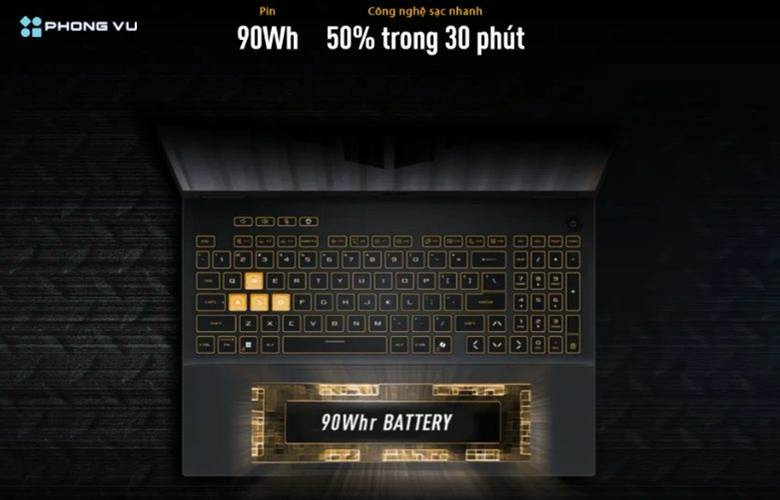 Vỏ nhôm cao cấp với logo TUF khắc laser sang trọng, đạt chuẩn độ bền MIL-STD-810H chống va đập và rung lắc. Viên pin dung lượng lớn 90Wh kết hợp công nghệ sạc nhanh 100W qua cổng USB-C giúp bạn luôn sẵn sàng cho mọi hành trình mà không lo gián đoạn ng.uồn năng lượng.