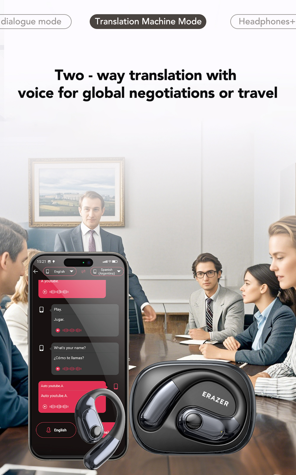 Giao tiếp ngôn ngữ thuận tiện: hỗ trợ dịch giọng nói hai chiều, thích hợp cho các cuộc đàm phán kinh doanh toàn cầu, du lịch, cuộc họp và các cuộc trò chuyện hàng ngày, v.v., dễ dàng phá vỡ rào cản ngôn ngữ và giúp giao tiếp trơn tru.
