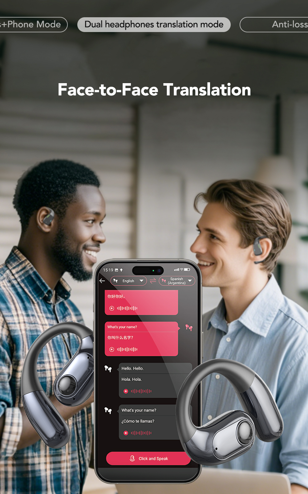 Giao tiếp trực tiếp thân thiện: Khi giao tiếp trực tiếp, mỗi người có thể đeo tai nghe để giao tiếp, dịch theo thời gian thực và có trải nghiệm tương tác tốt.