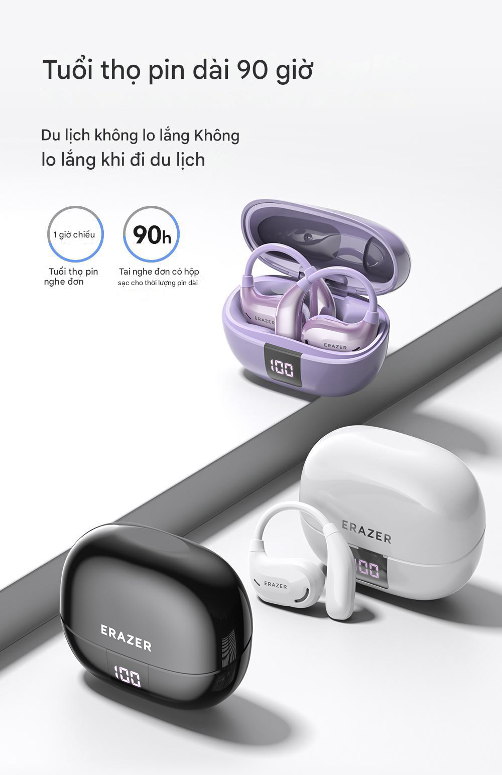 Không lo lắng khi di chuyển, nghe nhạc liên tục 48 giờ. Tai nghe đơn kèm hộp sạc, thời lượng pin lên đến 90 giờ.