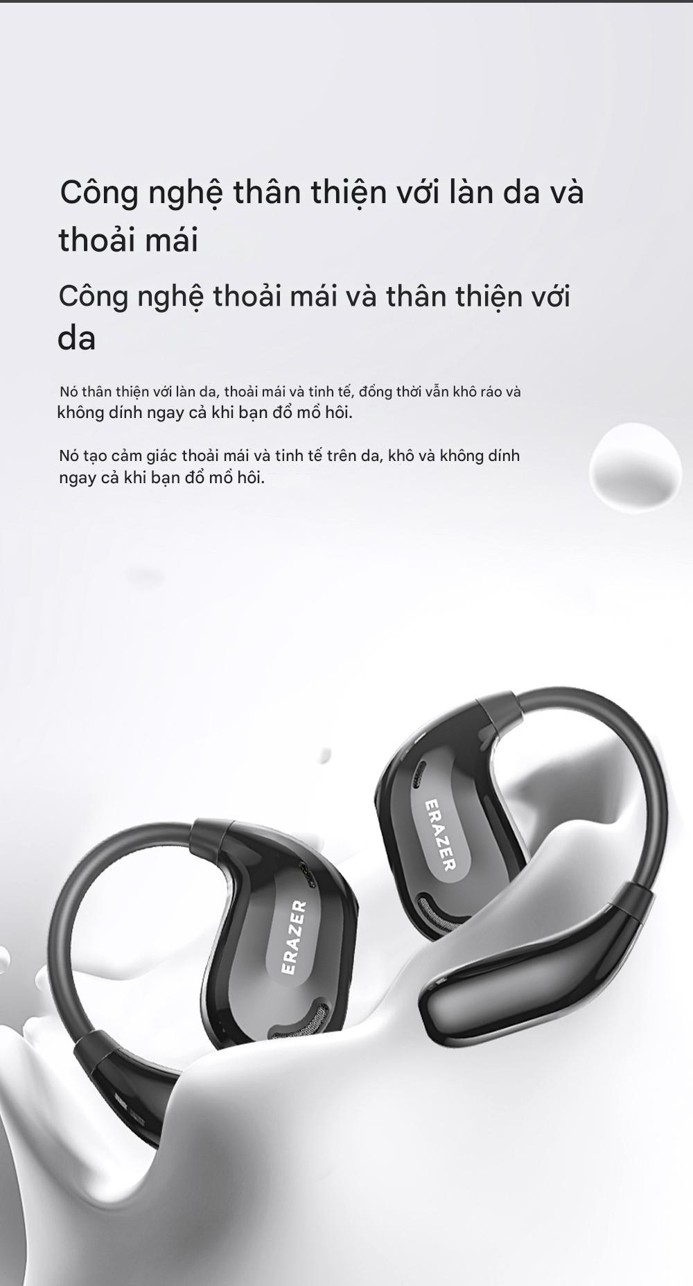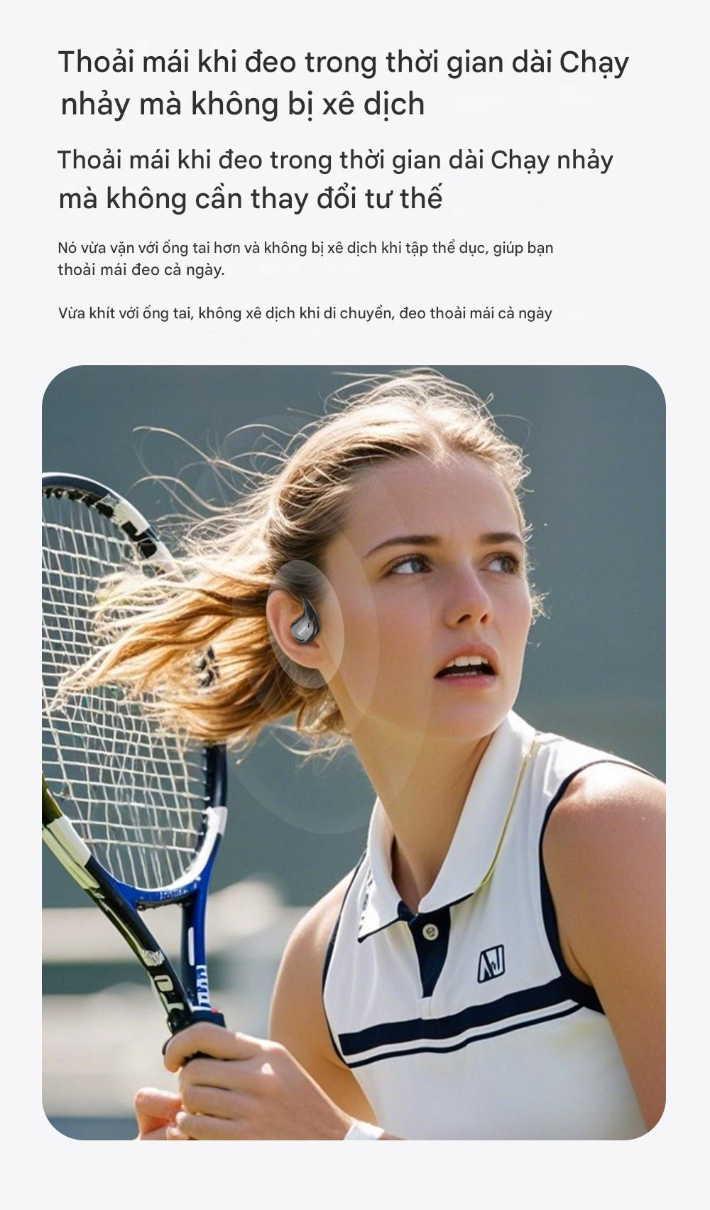 Thoải mái khi đeo trong thời gian dài, không bị trượt khi nhảy, không gây cảm giác khó chịu và đau tai khi đeo, vừa vặn với ống tai.
