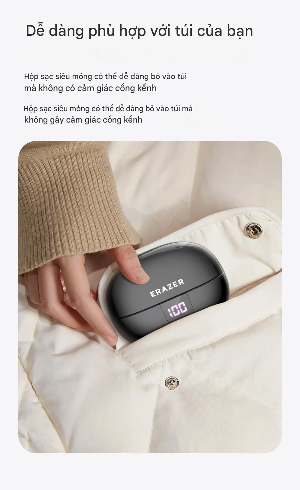 Mức độ chống nước: IPX5 cho tai nghe, ngăn sạc không chống nước