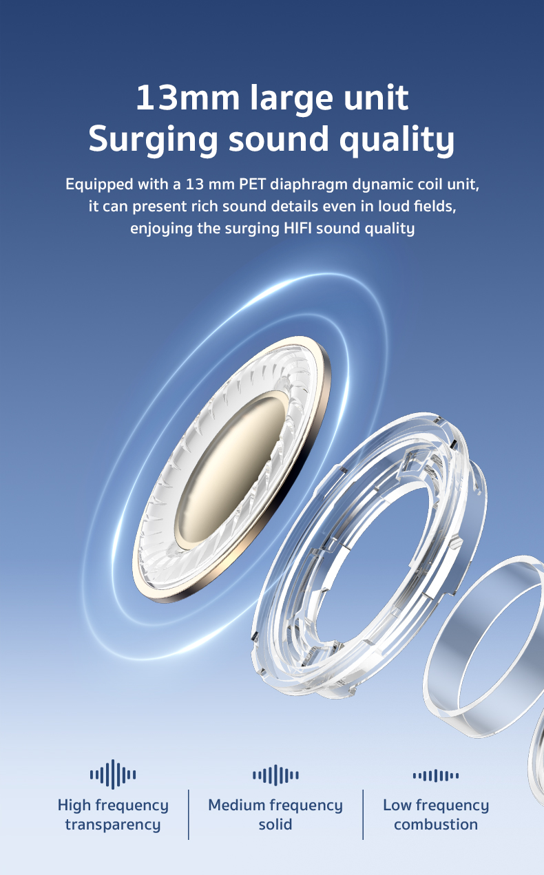 Được trang bị Bộ cuộn dây động của màng loa Pet 13 MM, anh ấy có thể mang lại chi tiết âm thanh phong phú ngay cả trong trường lớn, tận hưởng chất lượng âm thanh của HLFL