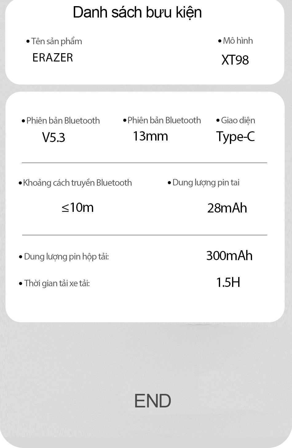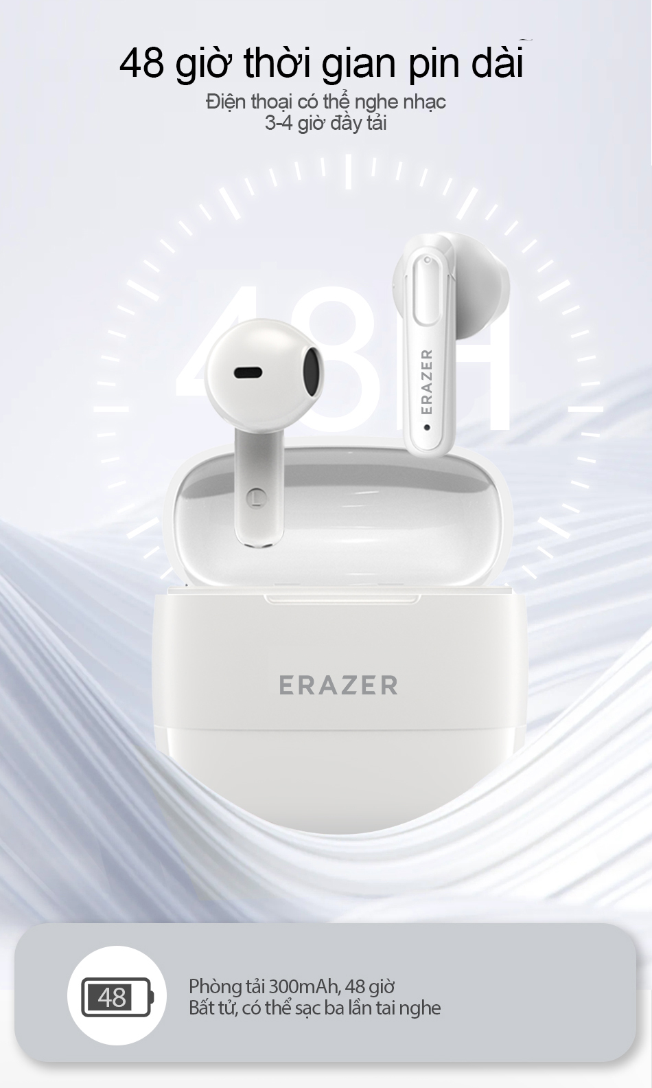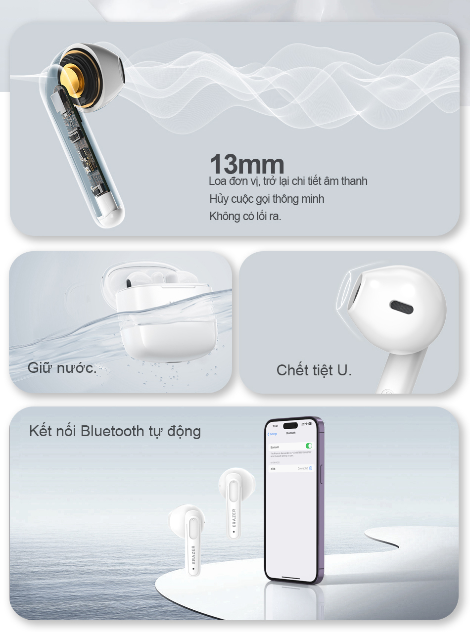 Hộp sạc sử dụng thiết kế từ tính , đầu vào Loại C. sạc nhanh hơn . Ipx5 chống thấm nước và chống bụi , không sợ gió , mưa và mồ hôi . Hỗ trợ tất cả các thiết bị bluetooth. máy tính-tablets iOS 'Android , v.v .
