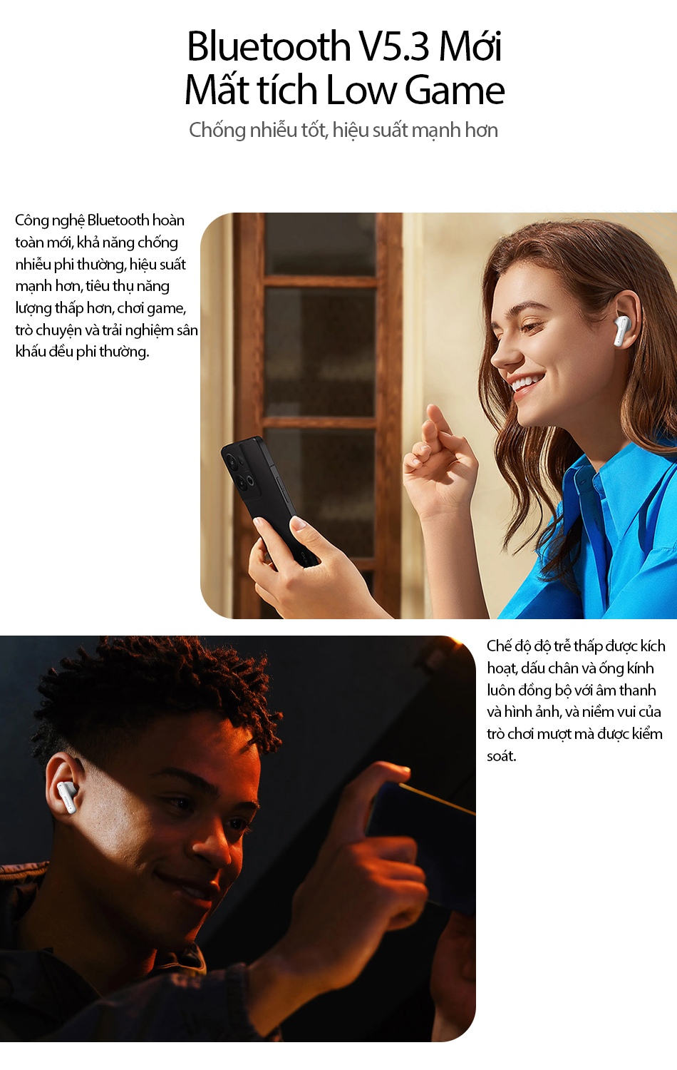 Được trang bị chip xử lý kép thông minh , sau khi điện thoại di động truyền tín hiệu , tai nghe trái phải sẽ nhận được tín hiệu đồng bộ , giảm độ trễ và ổn định tín hiệu truyền. tín hiệu. Sau khi kết nối Bluetooth đầu tiên của điện thoại di động thành công , kết nối tiếp theo sẽ tự động được ghép nối và thiết kế đơn giản rất thoải mái khi đeo .