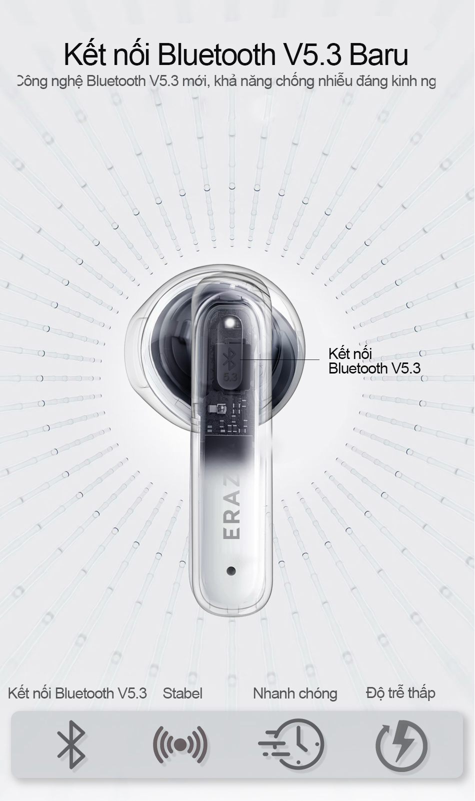 Tai nghe TWS này có độ trễ thấp , chất lượng âm thanh nổi HiFi . Chip Bluetooth 5.4 được nâng cấp Phù hợp với nhiều sản phẩm Bluetooth khác nhau , không chỉ mang đến cho bạn âm nhạc chất lượng cao hơn mà còn giảm tiêu thụ điện năng và ổn định kết nối .