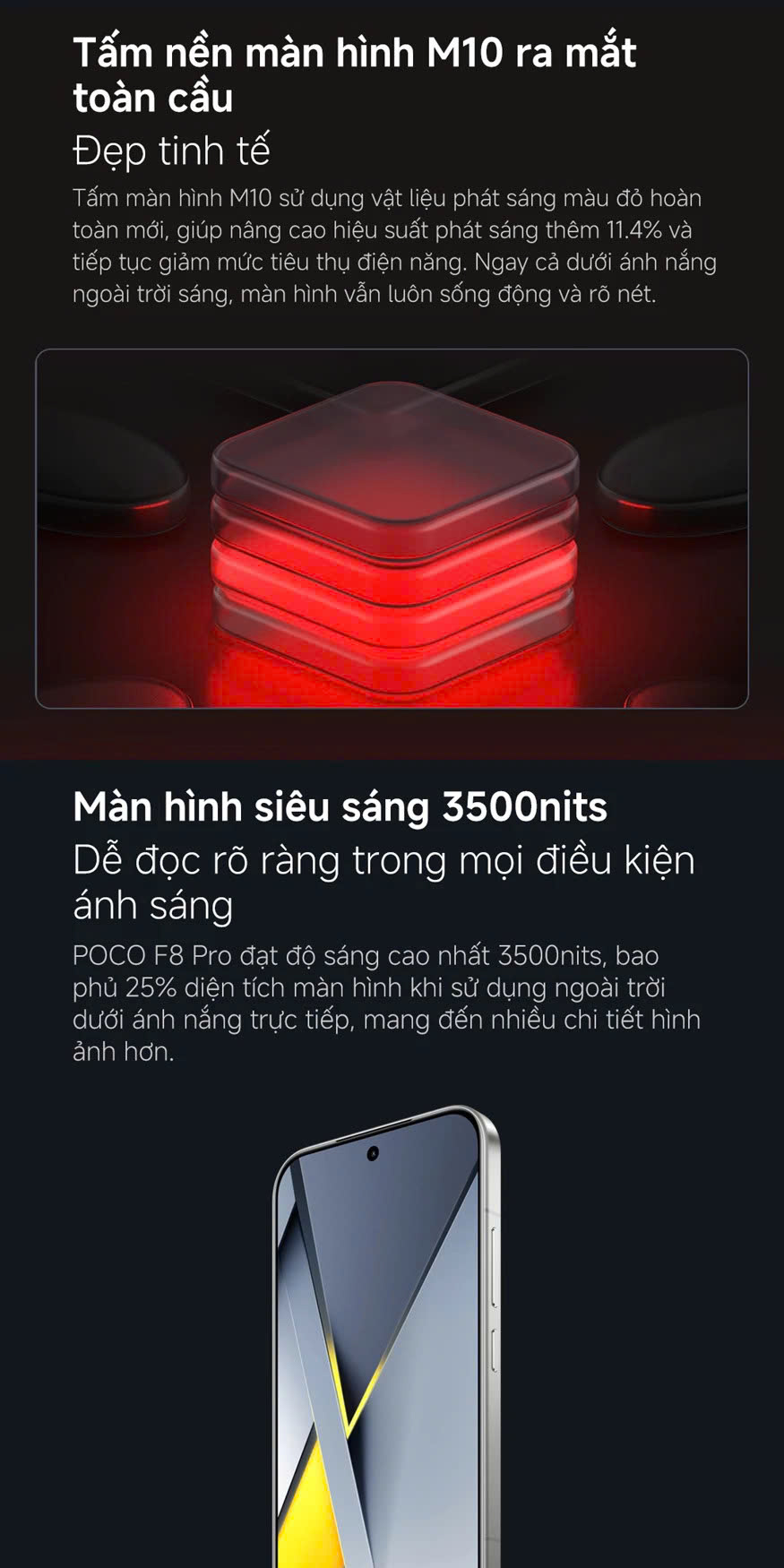 - Độ sáng tối đa: 3500 nits che phủ 25% hiển thị
