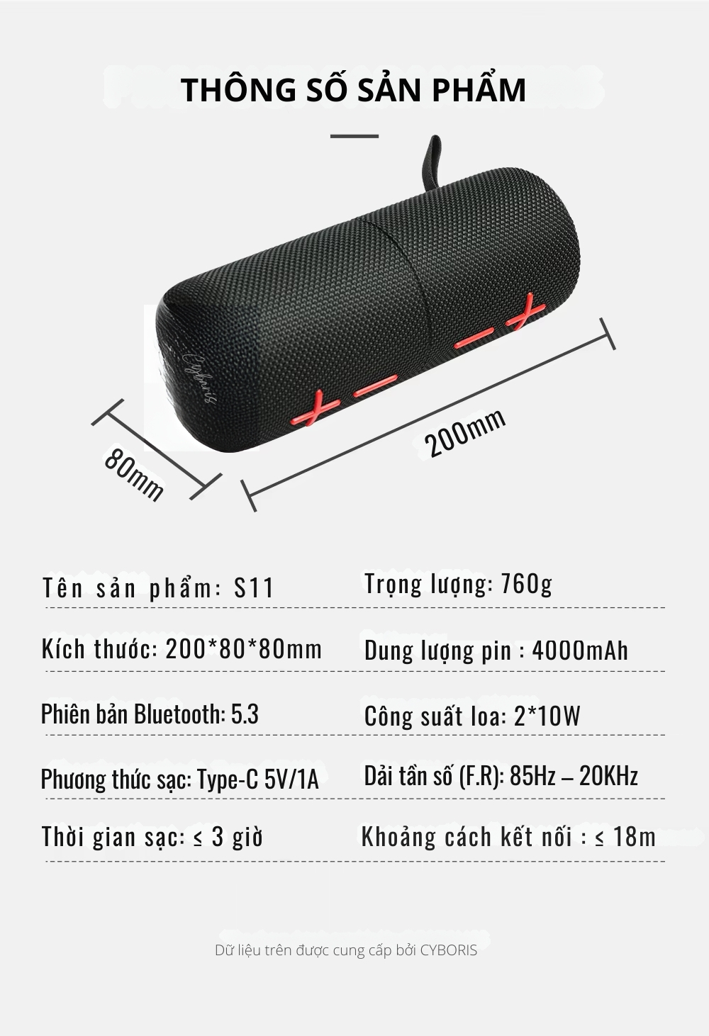 ⚙️ THÔNG SỐ KỸ THUẬT Loa Bluetooth Cyboris S11 20W