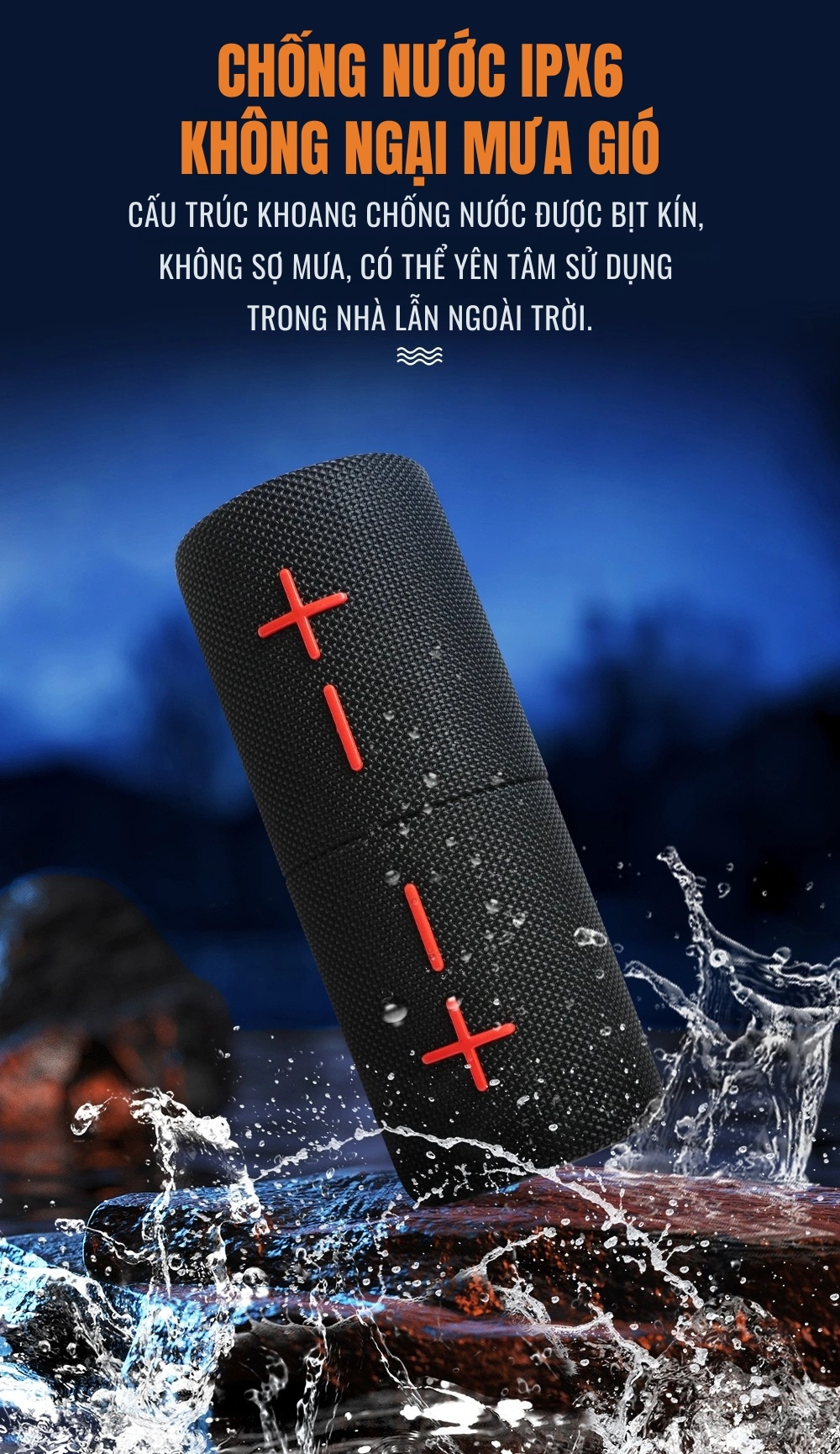 ✔️ chống nước IPX6 ( có thể tiếp xúc nước mưa, hoặc nước bắn nhẹ - KHÔNG có khả năng ngâm hoàn toàn trong nước).