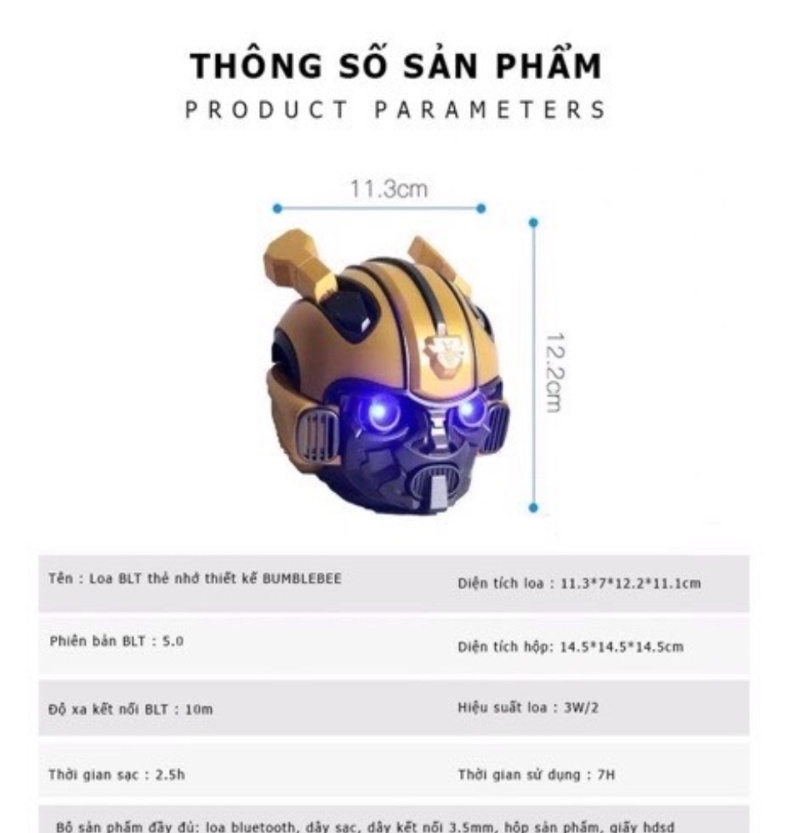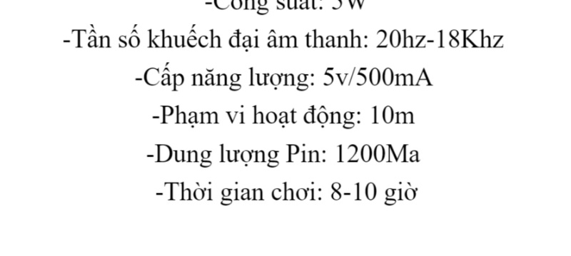 ✨Thông số kỹ thuật: -Công suất: 5W -Tần số khuếch đại âm thanh: 20hz-18Khz -Nguồn điện: 5v / 500mA -Dải hoạt động: 10m -Công suất pin: 1200Ma -Thời gian phát: 8-12 giờ