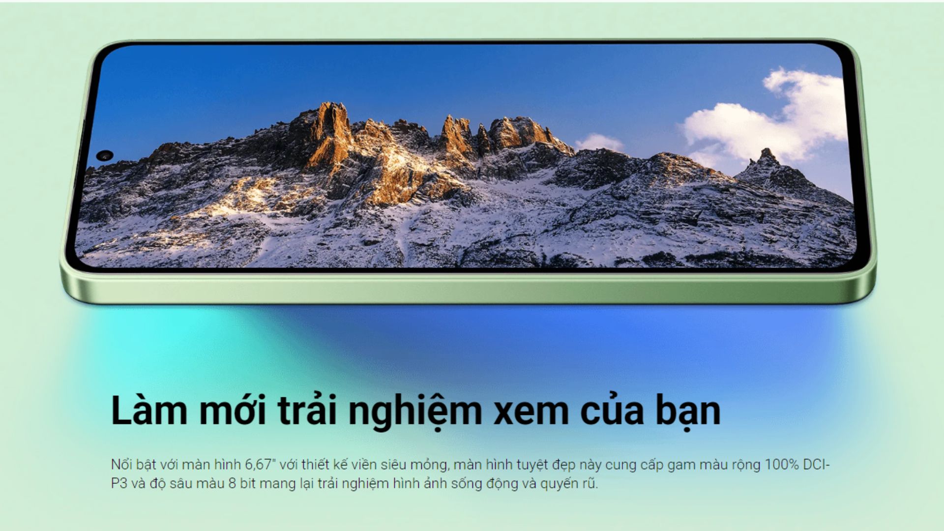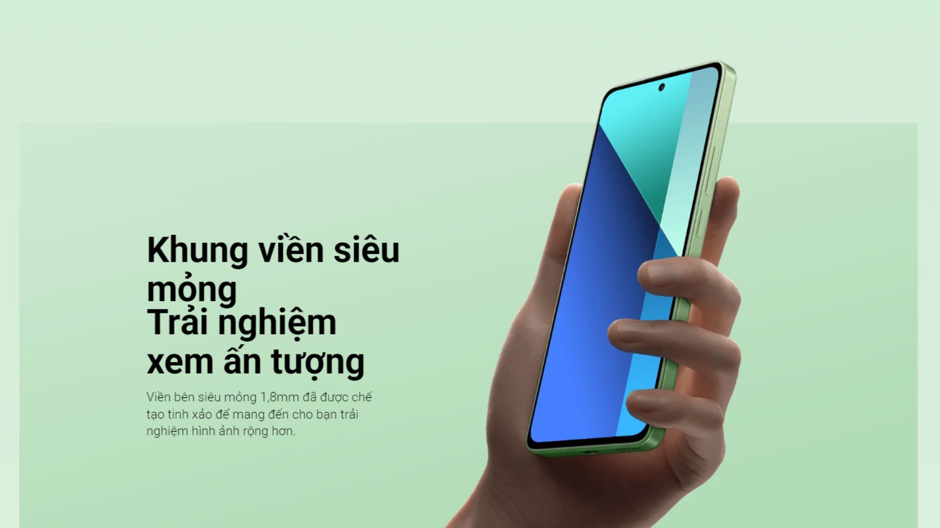 Redmi Note 13 sở hữu màn hình AMOLED 6.67 inch độ phân giải Full HD+, mang đến hình ảnh sắc nét, sống động với màu sắc rực rỡ. Tấm nền AMOLED giúp hiển thị rõ ràng ngay cả dưới ánh nắng mặt trời với độ sáng tối đa lên đến 1800 nit.