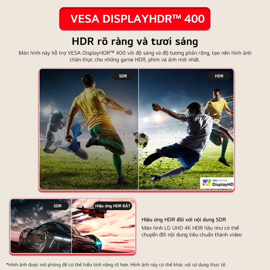 Màn hình LG UHD 4K HDR hầu như có thể chuyển đổi nội dung tiêu chuẩn thành video chất lượng HDR ngay trên màn hình. Nhờ đó, tông màu và độ sáng của nội dung SDR được cải thiện để mang lại trải nghiệm giống như HDR.