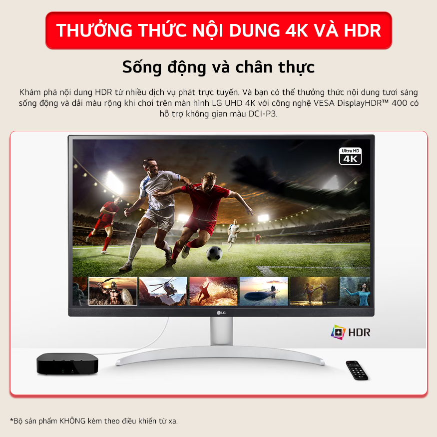 Khám phá nội dung HDR từ nhiều dịch vụ phát trực tuyến. Và bạn có thể thưởng thức nội dung tươi sáng sống động và dải màu rộng khi chơi trên màn hình LG UHD 4K với công nghệ VESA DisplayHDR™ 400 có hỗ trợ không gian màu DCI-P3.