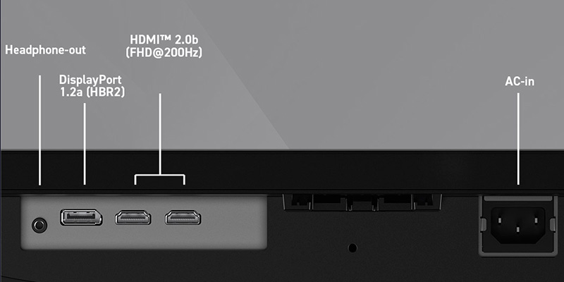 Được trang bị 2 cổng HDMI 2.0b, 1 DisplayPort 1.2a (HBR2), 1 jack tai nghe 3.5mm và khóa Kensington. Cả hai giao thức HDMI và DP đều hỗ trợ Full HD ở 200Hz, tương thích hoàn hảo với PC,laptop và các thiết bị chơi game console.