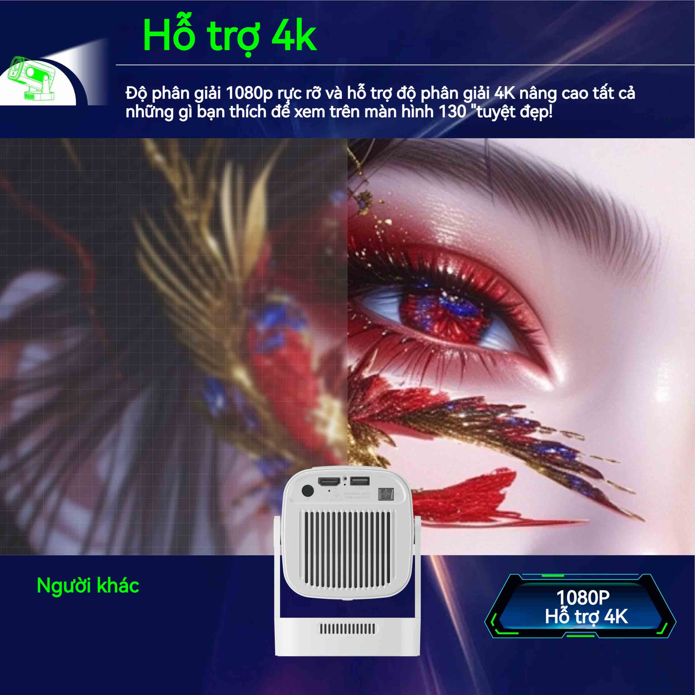 hỗ trợ phát lại video 4K, độ sáng vượt trội ở mức 300 ANSI và 10000 lumen, cùng với tỷ lệ tương phản đặc biệt là 10000:1.