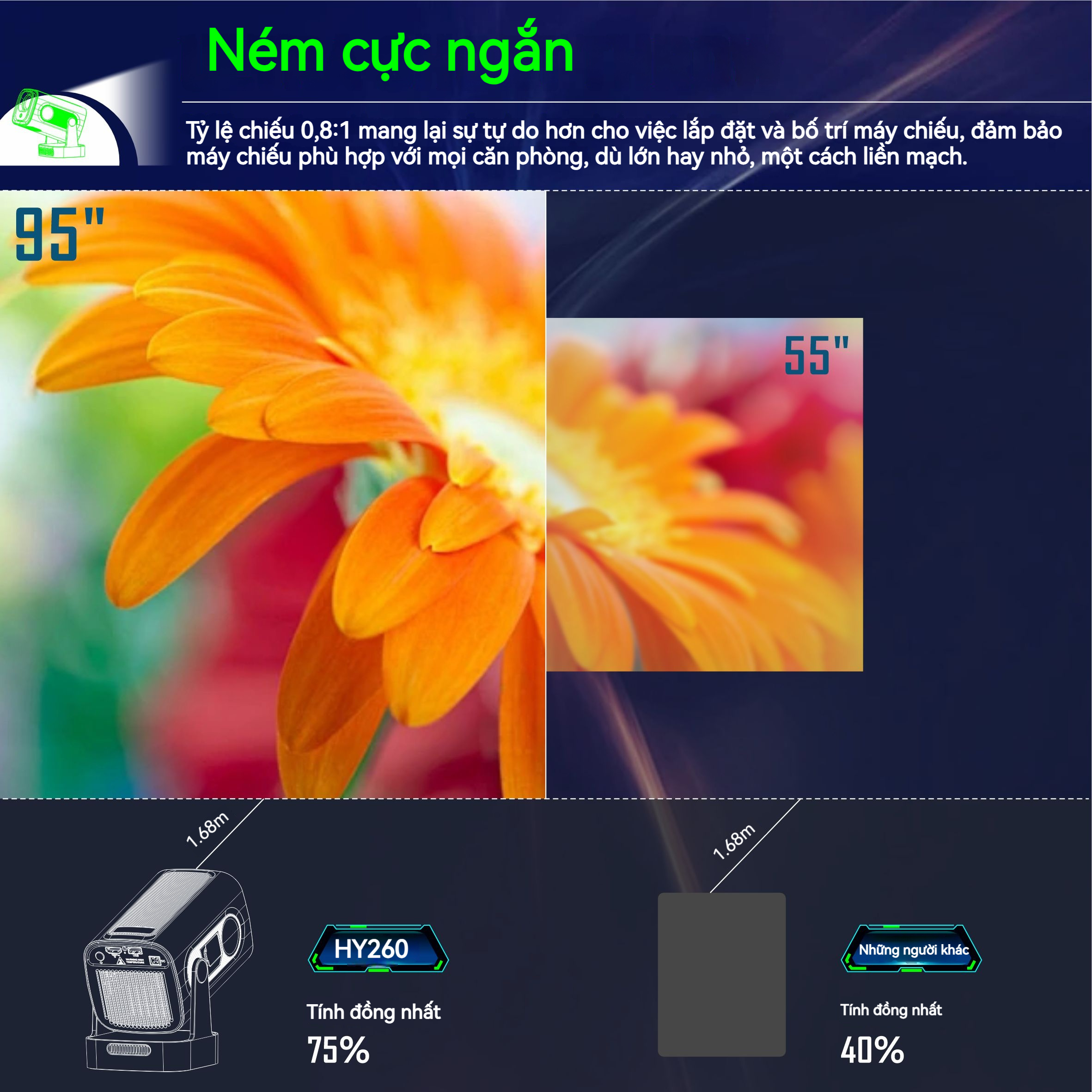 Khoảng cách chiếu: 0.6M-2.5M