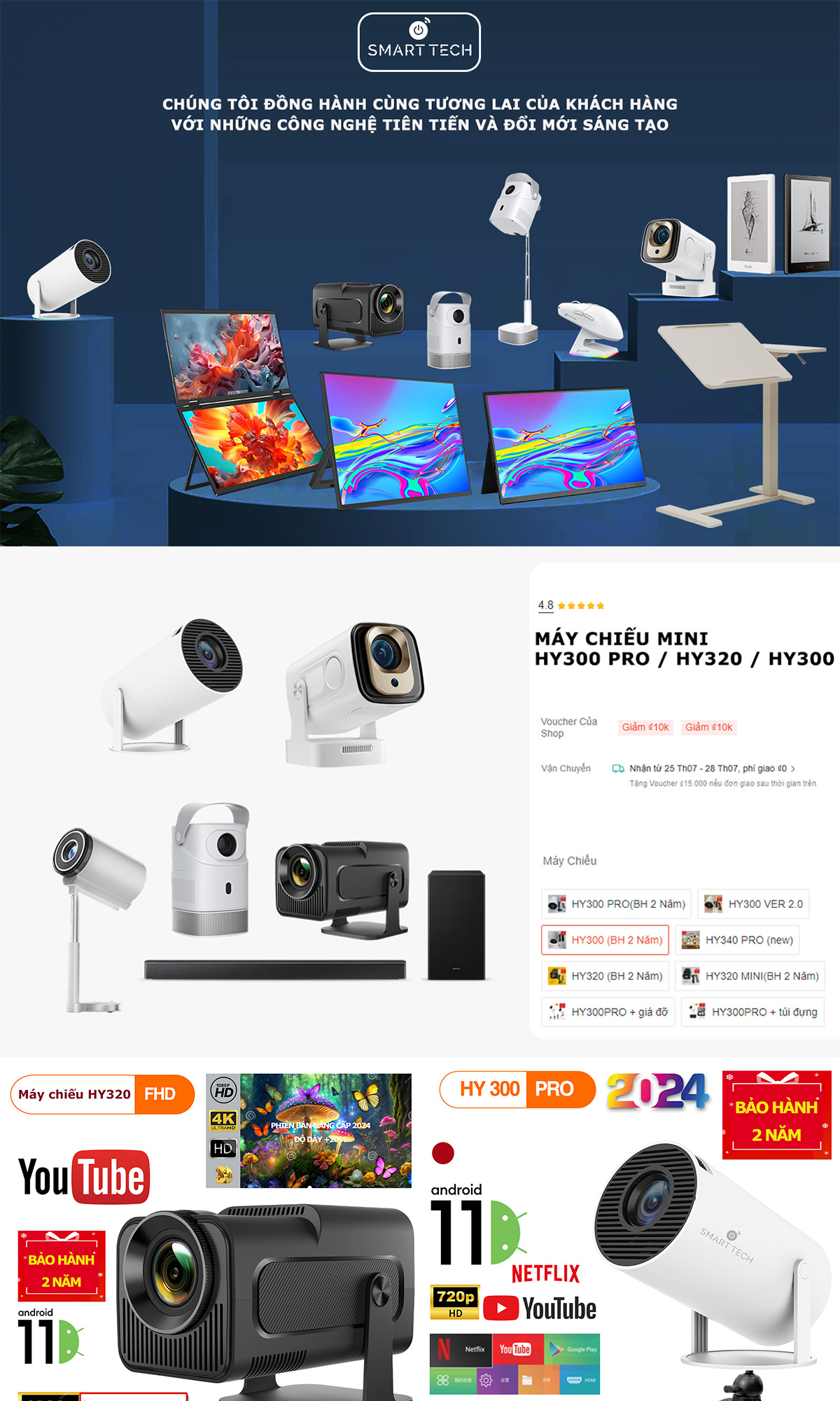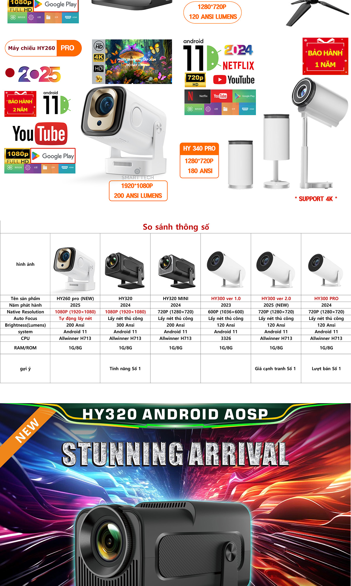 Máy chiếu mini HY320 / HY320 Mini / HY260 PRO Full HD android 11.0 độ sáng 300 ANSI