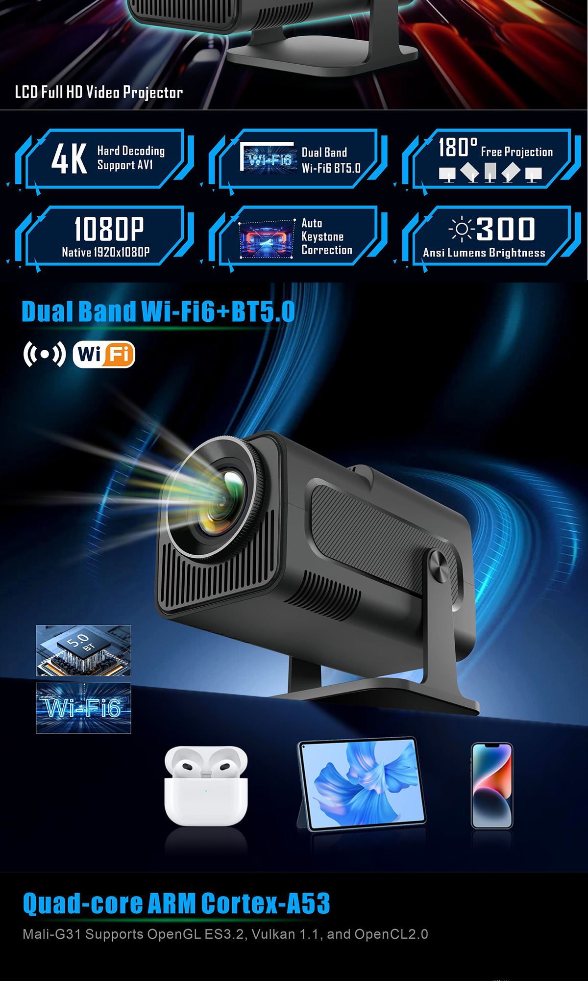 Máy chiếu di động mini HY320 Auto Keystone, Máy chiếu thông minh Native 1080P 4K được hỗ trợ 390Lumens với WiFi 6, BT 5.0, Điều chỉnh màn hình, Xoay 180 độ, Hệ điều hành Android 11.0 tích hợp
