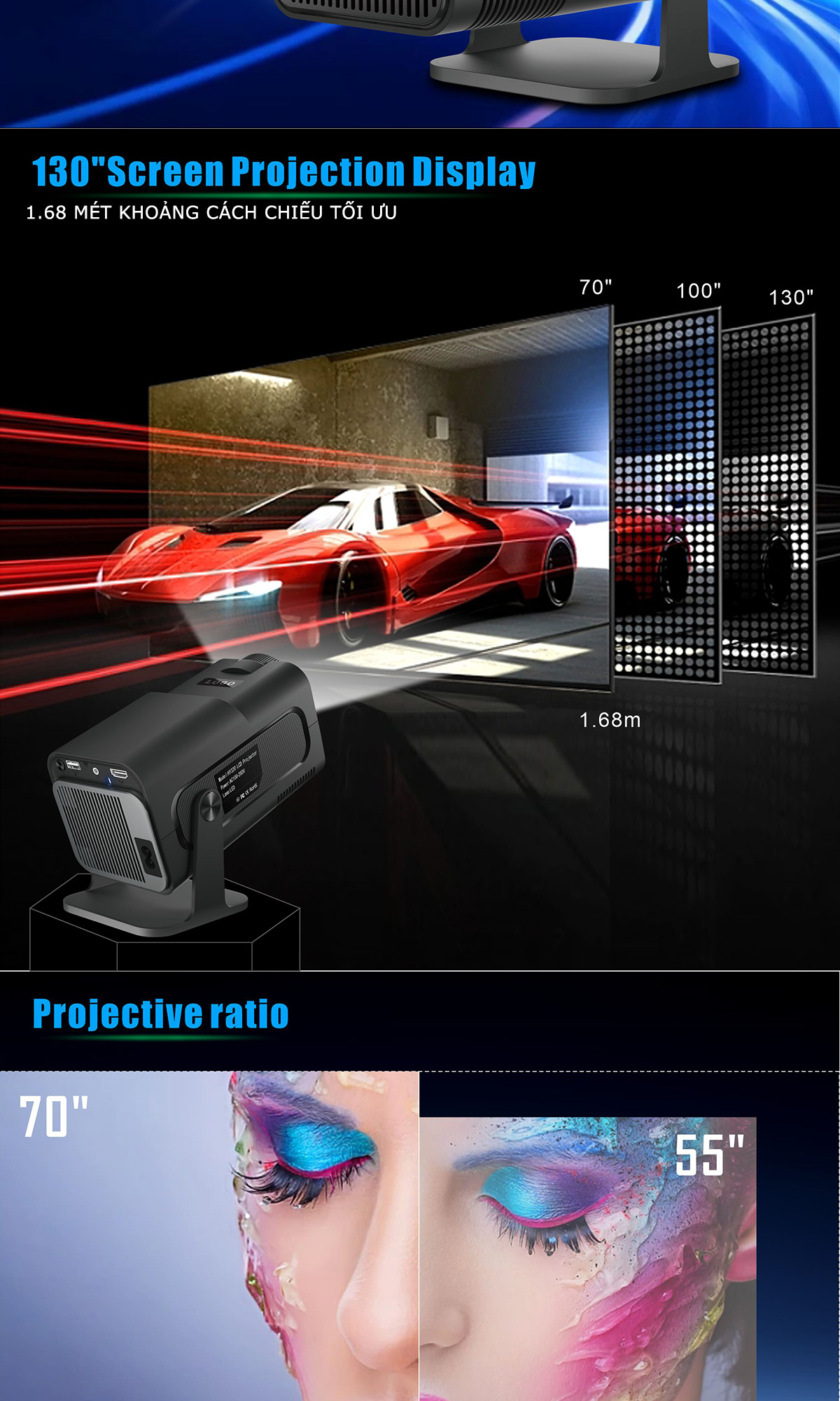 Kích thước chiếu: 30-150 inch