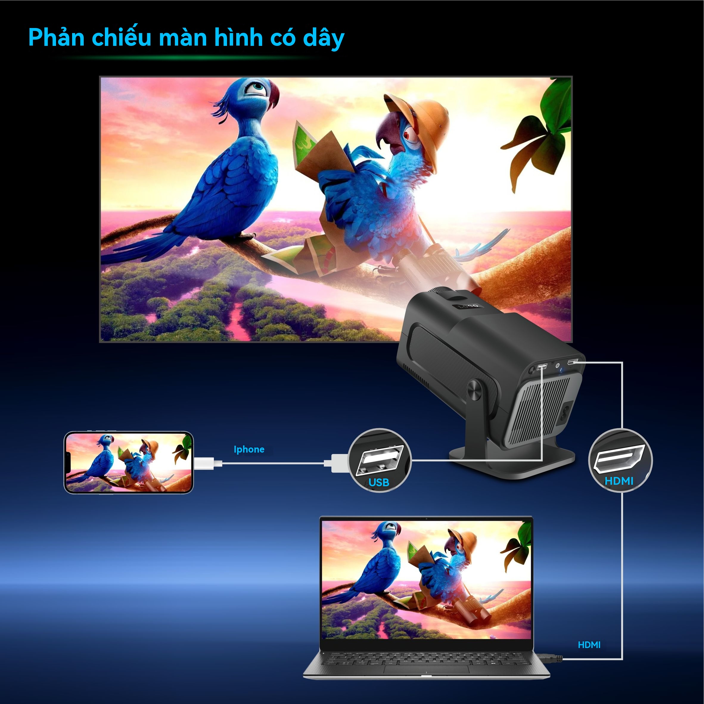 3. HỖ TRỢ CHỨC NĂNG ZOOM: Được trang bị WiFi mới nhất cho tính năng phản chiếu màn hình điện thoại thông minh iOS và Android. Nâng cấp lên mạng LAN không dây cực nhanh để có trải nghiệm xem không bị lag. Hỗ trợ chức năng ZOOM, cho phép bạn dễ dàng giảm kích thước hình ảnh từ 100 xuống 50 phần trăm mà không cần di chuyển máy chiếu.