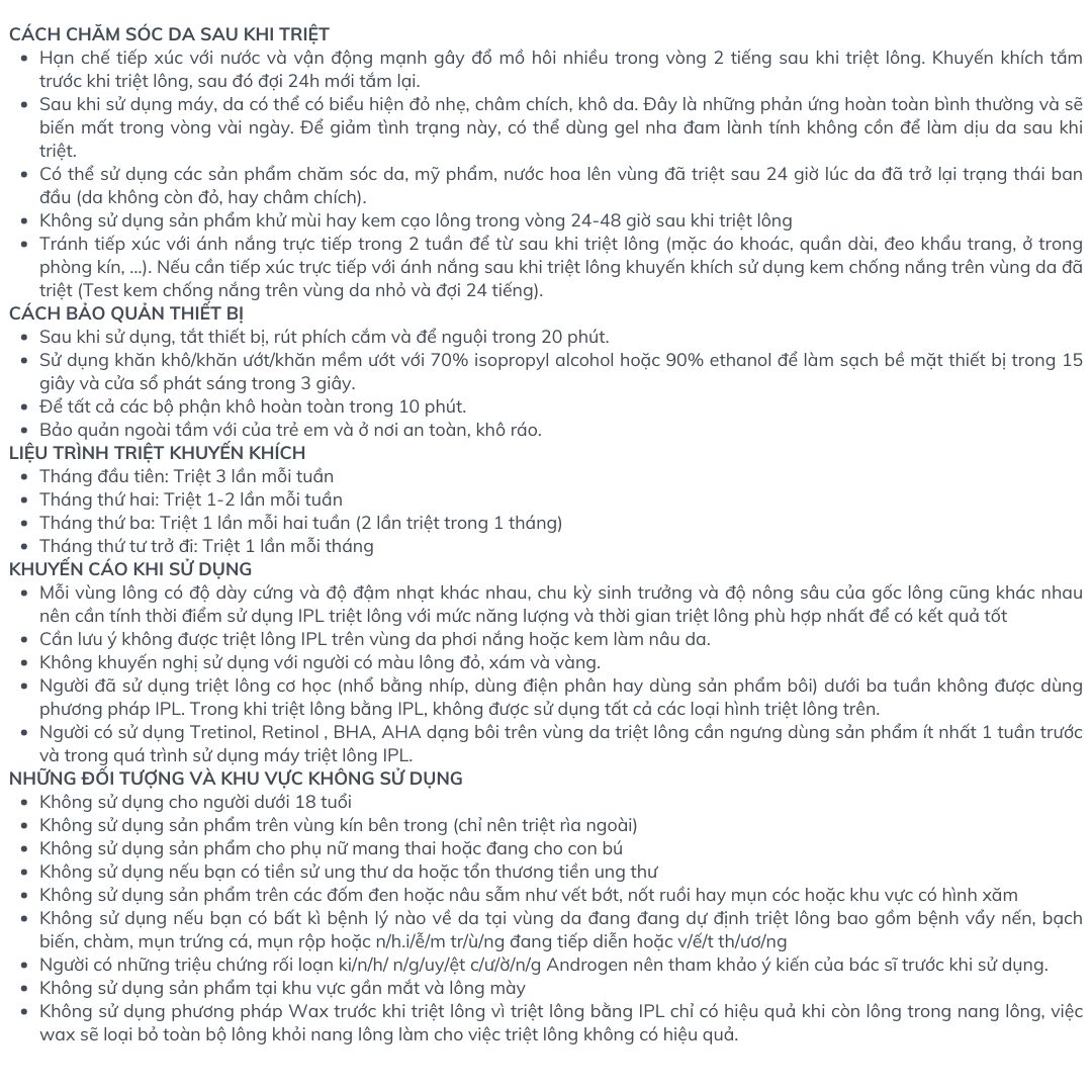 - 4 Chế độ triệt & 5 Cường độ ánh sáng: Có thể điều chỉnh phù hợp với mọi loại da