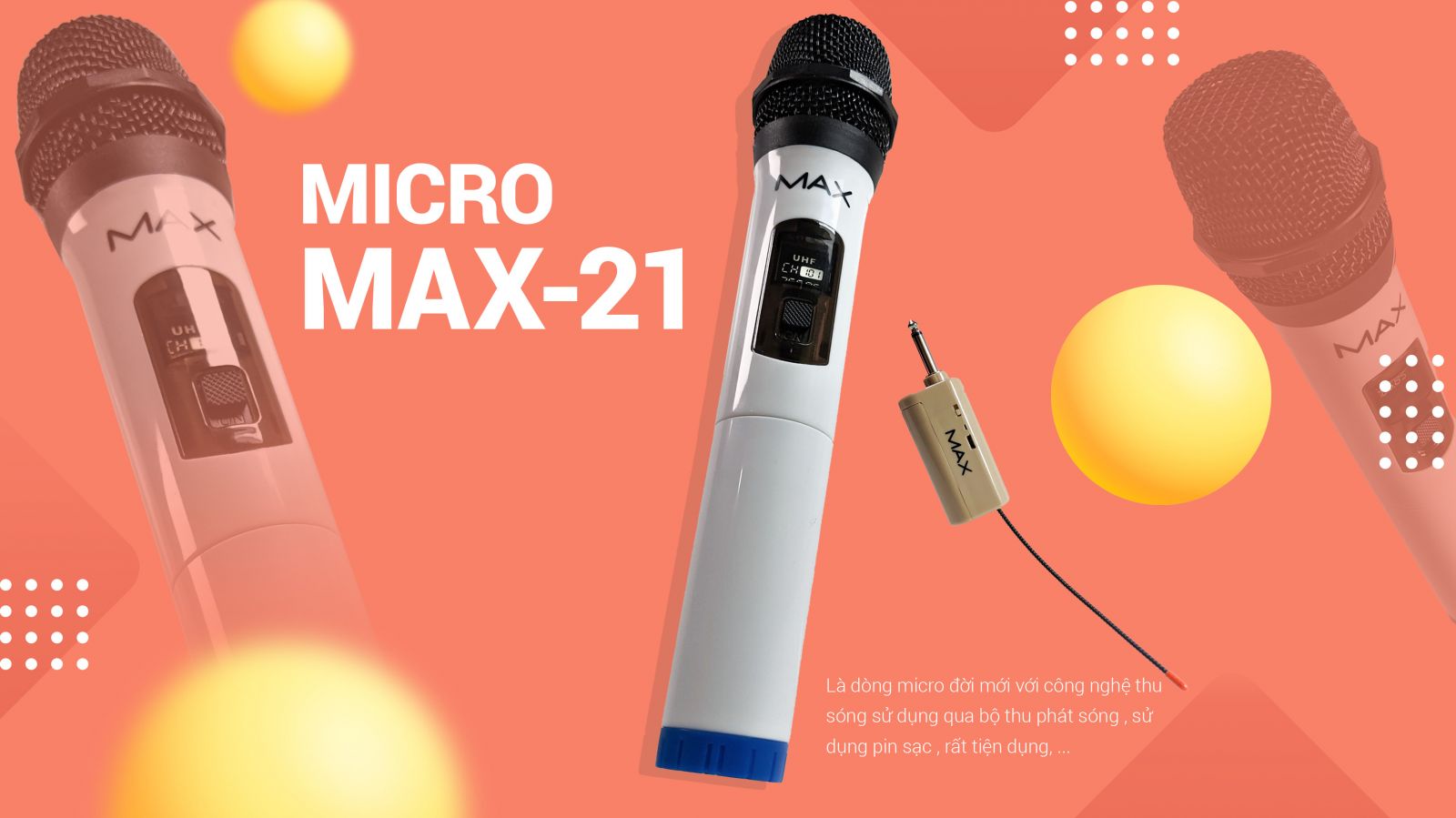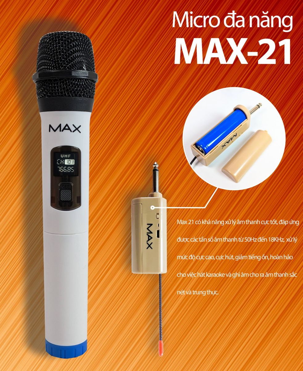 Để hát Karaoke thả ga, một chiếc micro hiện đại, tiện nghi, cho chất giọng hay là không thể thiếu. Hãng Max giới thiệu tới người dùng dòng micro không dây Max 21, kết nối không dây đơn giản, nhanh chóng, đầu thu sử dụng pin sạc dung lượng lớn đảm bảo hoạt động bền bỉ, hát thả ga mà không cần sạc quá nhiều lần. Micro hát Karaoke Max 21 là dòng sản phẩm cao cấp hiện nay mà bất cứ gia đình, quán hát hay các cuộc vui chơi không thể thiếu.