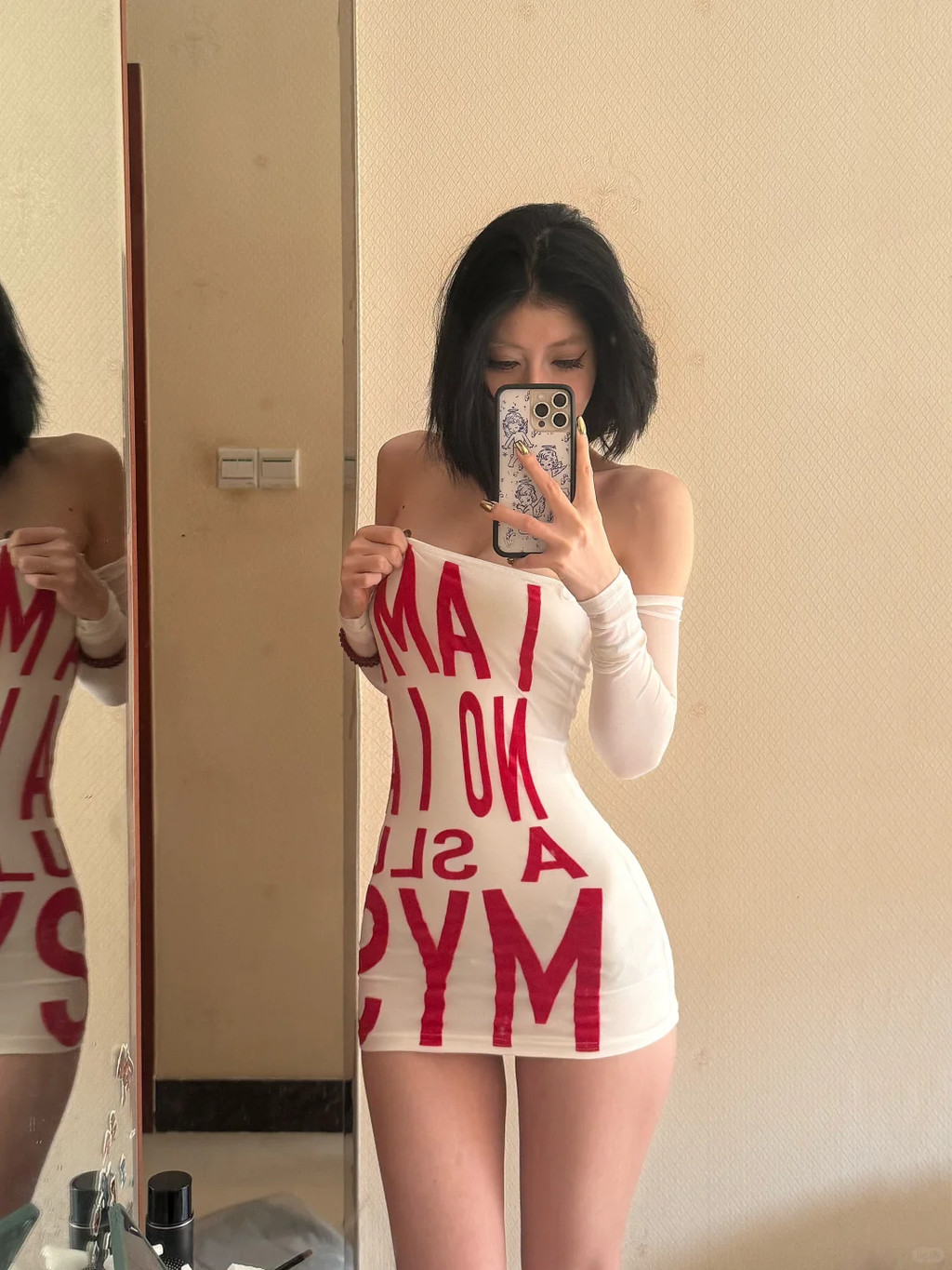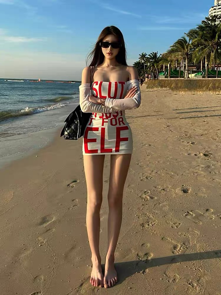 Mỹ Hot Girl Một Vai In Hình Đầm Dài Tay Gợi Cảm Slim-Fit Ôm Hơn Nhìn Bên Trong Hông