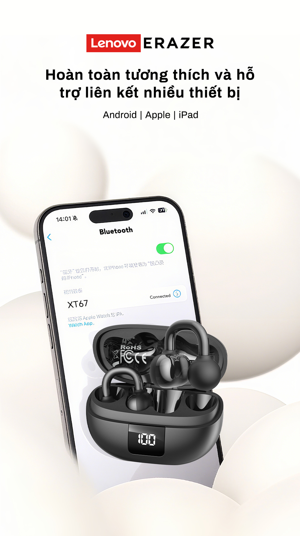 Tên sản phẩm: [Nâng cấp] Lenovo ERAZER XT67 PRO 360° Tai nghe Bluetooth âm thanh Dolby Atmos Thiết kế kẹp tai Tai nghe dịch AI Hỗ trợ 134 ngôn ngữ Tai nghe không dây
