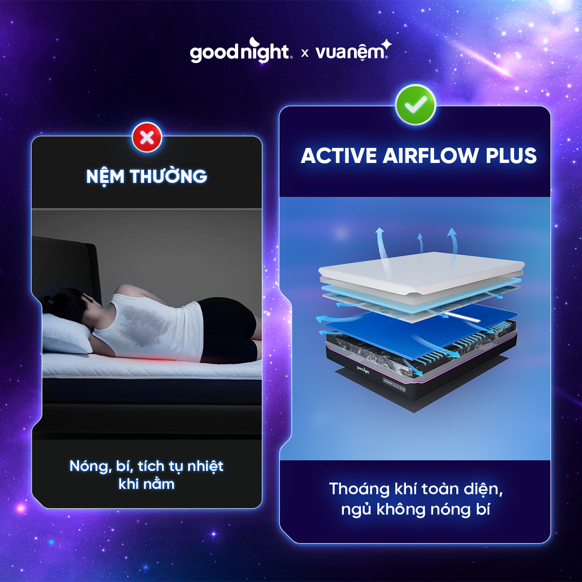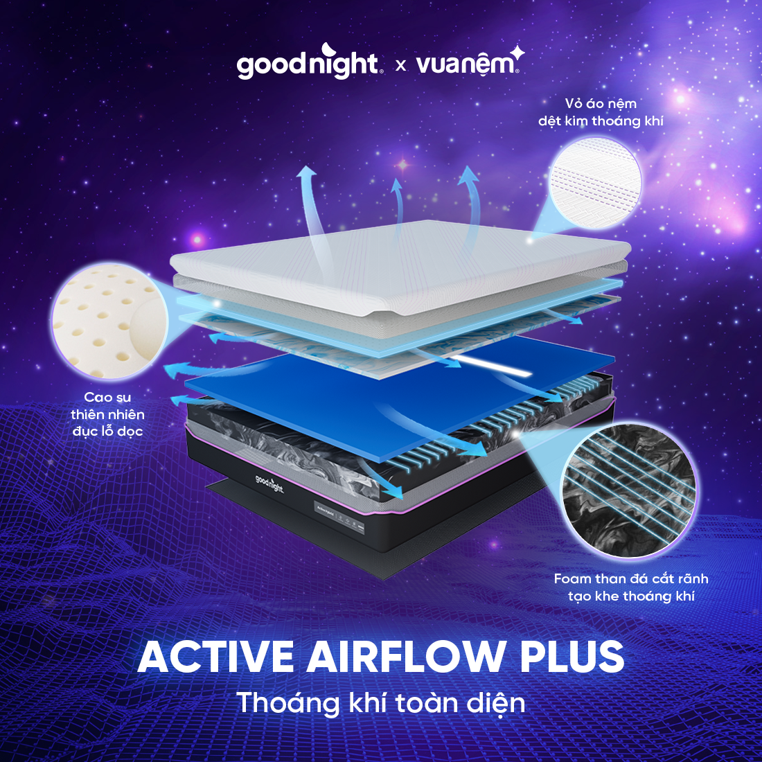 Không chỉ điều hòa thân nhiệt hiệu quả, Goodnight Active Hybrid còn được thiết kế tối ưu lưu thông không khí, giúp loại bỏ ẩm và nhiệt tích tụ nhờ cấu trúc kênh lưu thông khí đa chiều: