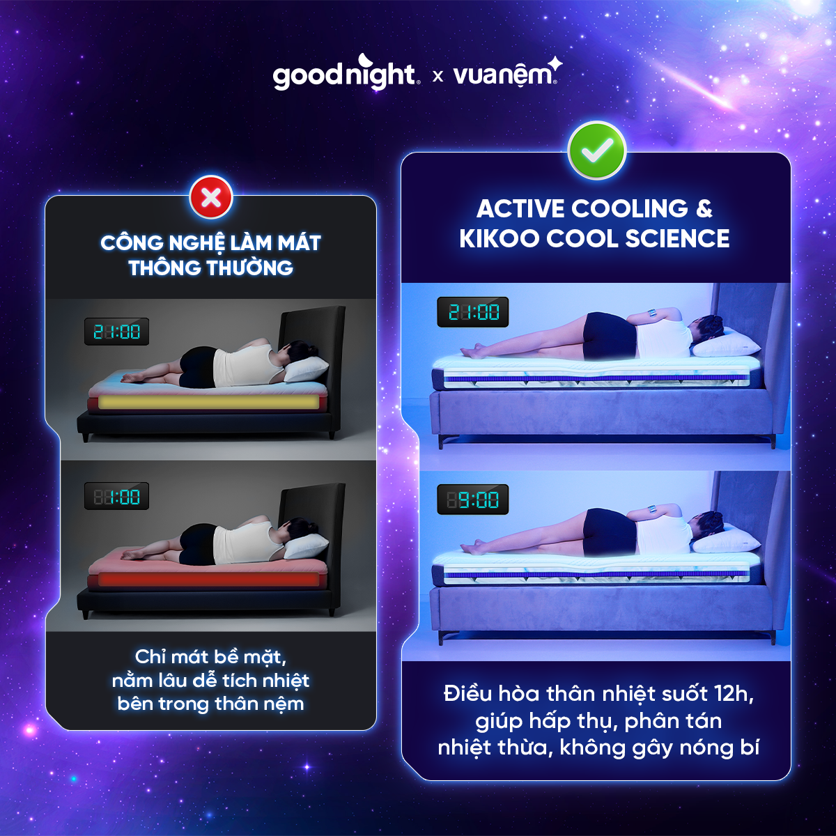 Nệm cao su foam Goodnight Active Hybrid là sản phẩm nệm đầu tiên tại Việt Nam ứng dụng công nghệ KIKOO Cool Science – công nghệ cân bằng nhiệt hiện đại đến từ Đức.