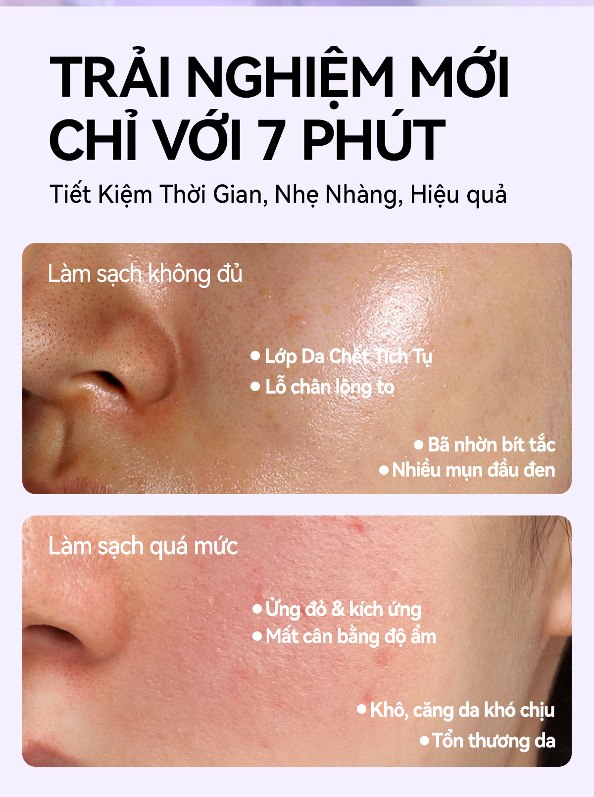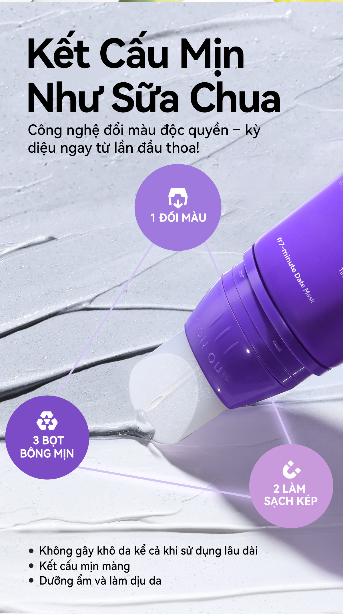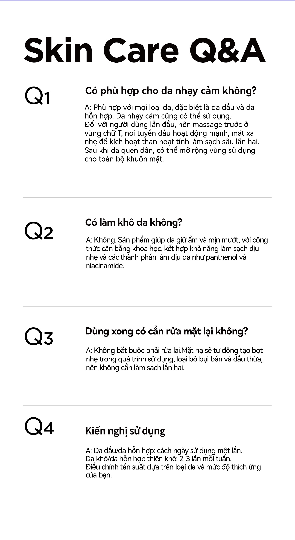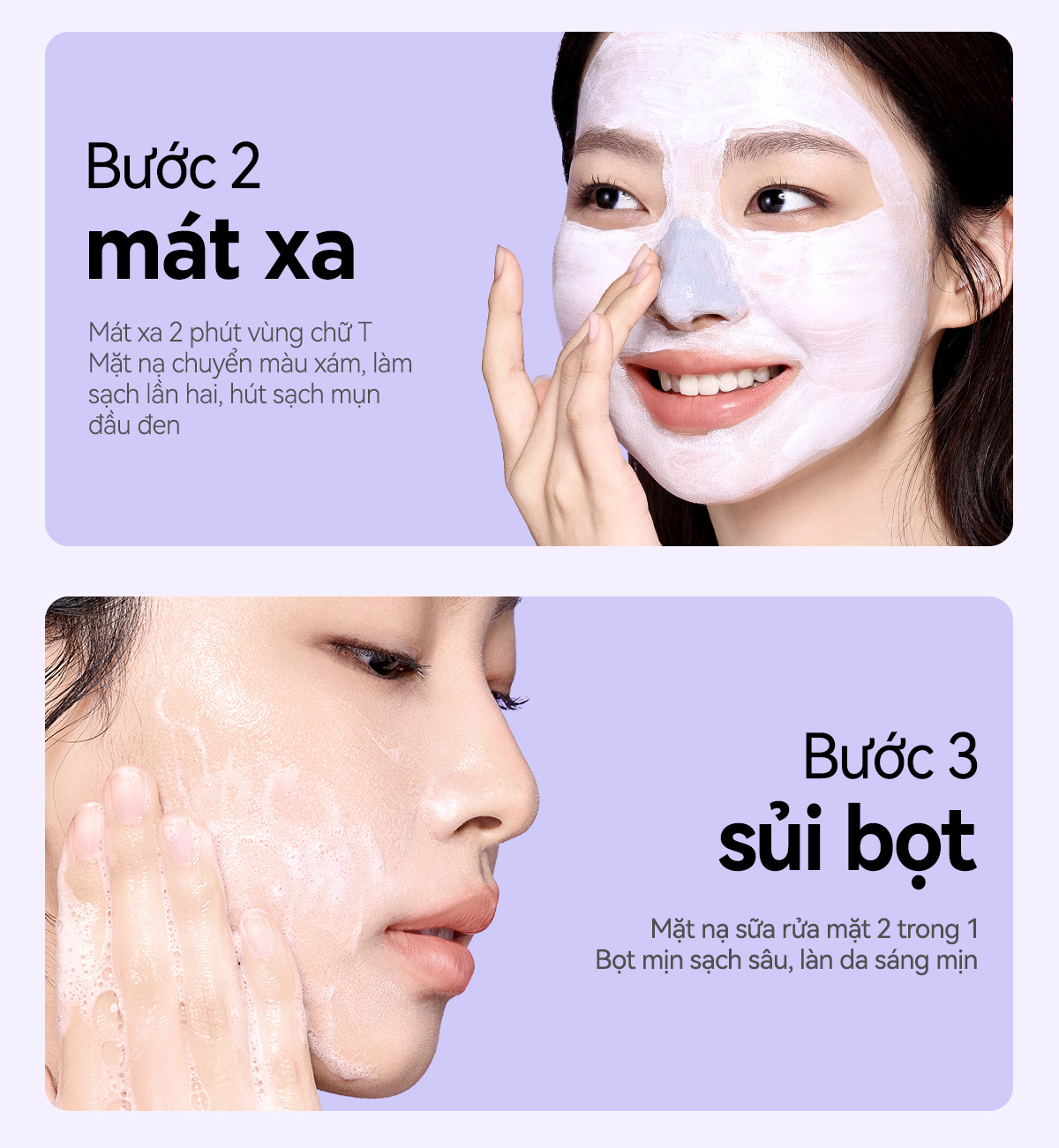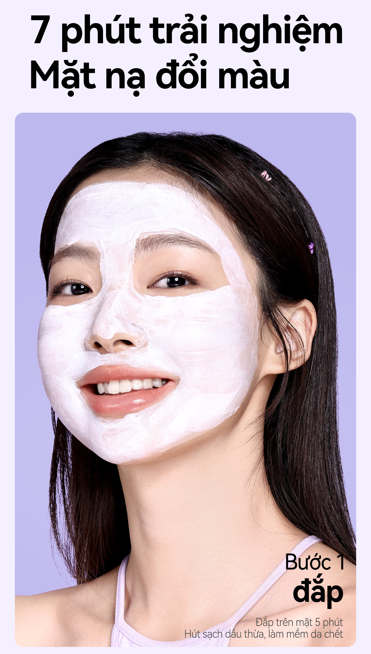- Công nghệ đổi màu độc quyền: Kích hoạt khi tiếp xúc da, xoa nhẹ đổi màu, làm sạch kép, tạm biệt mụn đầu đen.