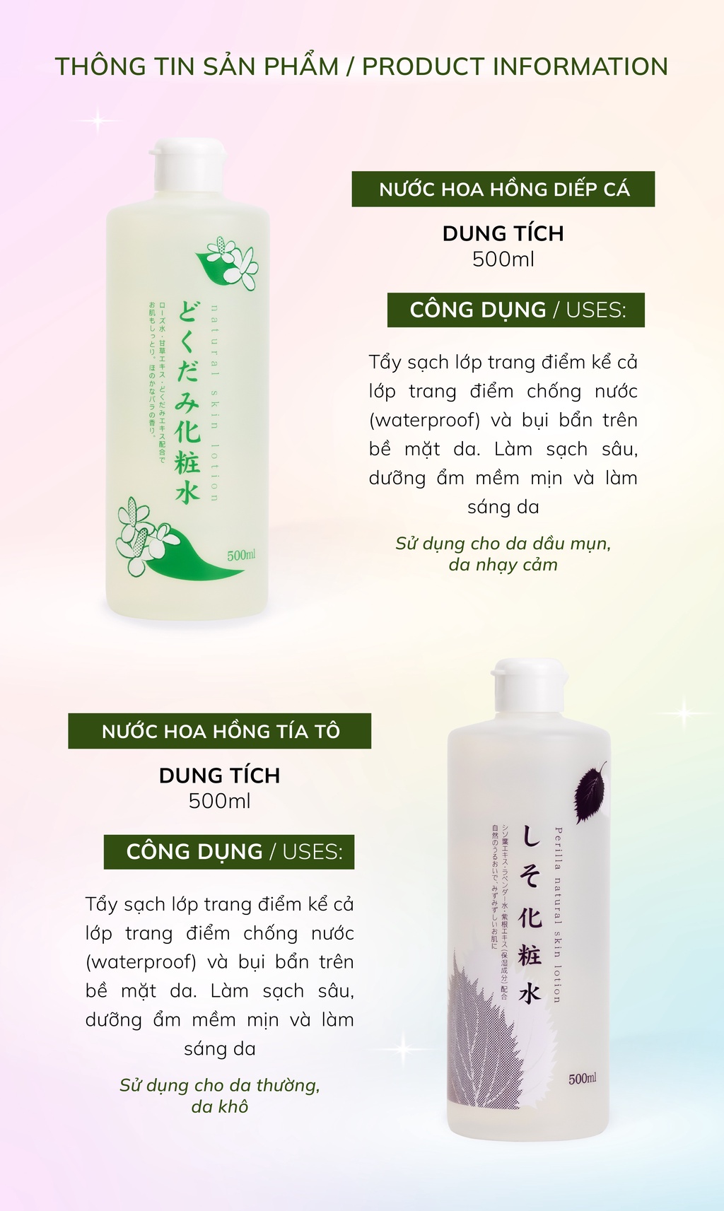 Nước hoa hồng toner diếp cá tía tô Dokudami Nhật Bản cho da mụn da dầu 500ml