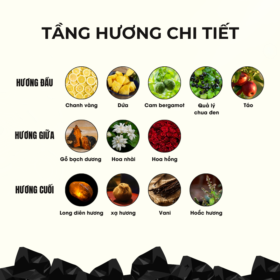 Hương đầu: Quả chanh vàng, quả lý chua đen, quả táo xanh, cam Bergamot, quả dứa