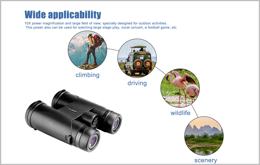 Độ phóng đại công suất 10X và trường nhìn lớn; khả năng bảo vệ vừa vặn của nó giúp nó có thể sử dụng để chịu được các điều kiện thời tiết khắc nghiệt nhất; áo giáp cao su hấp thụ va chạm để bảo vệ tối đa