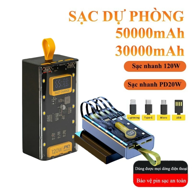 SẠC DỰ PHÒNG TRONG SUỐT 30.000–50.000mAh – SẠC NHANH PD 120W / 22.5W – 4 ĐẦU CÁP – MÀN HÌNH LED
