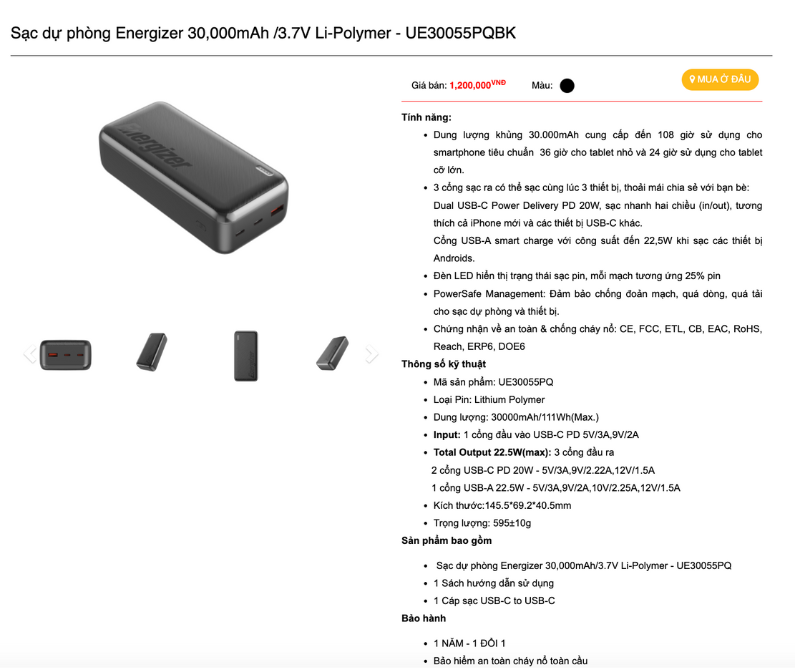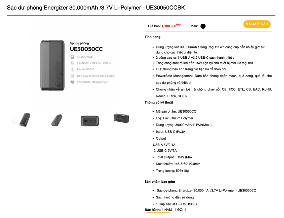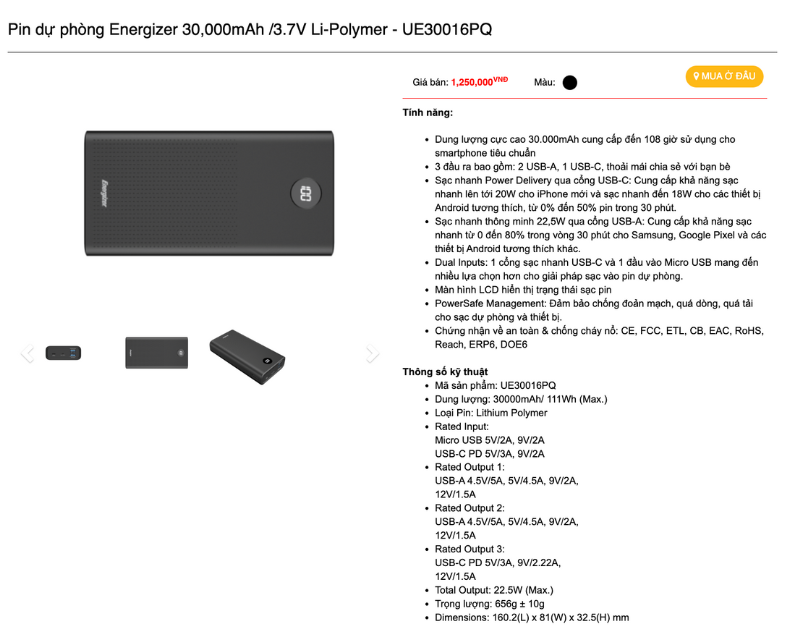 1 x Pin dự phòng Energizer 30.000mAh - UE30016PQ