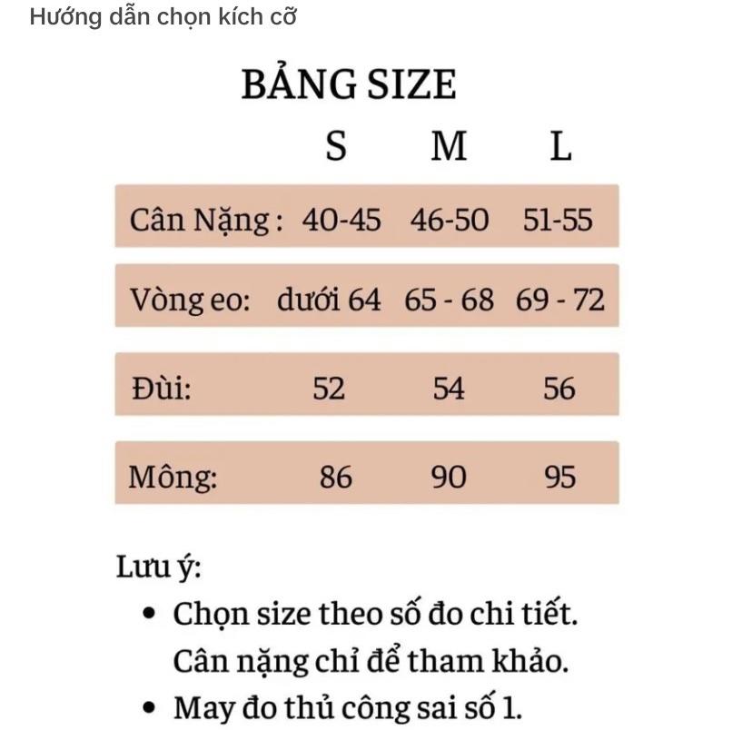 - Size S: Vòng eo 58-63cm, Vòng mông 86 - 90 cm, Cân nặng 40 - 45 kg, Chiều cao 150 - 160cm.