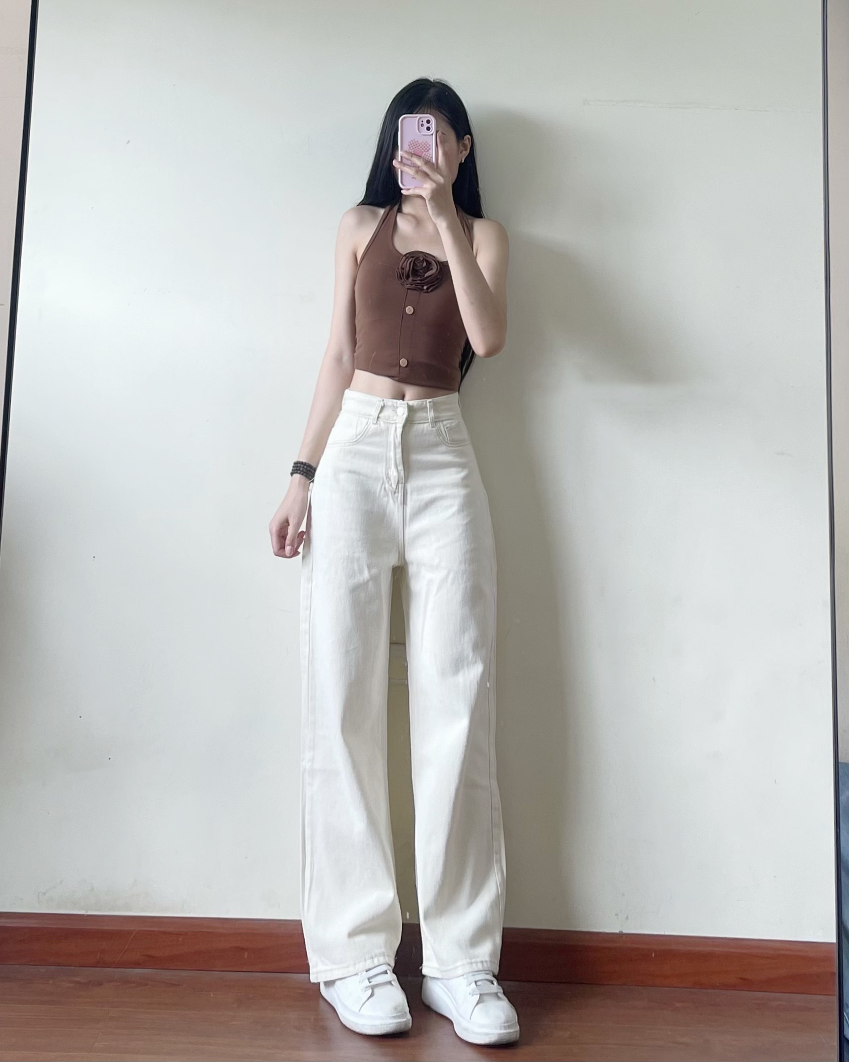 Quần jeans bò màu kem ống suông rộng phong cách Hàn Quốc