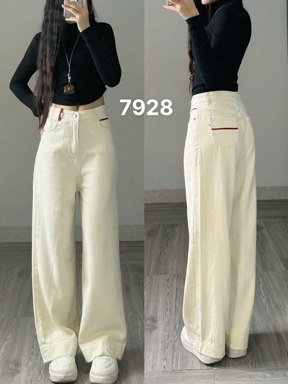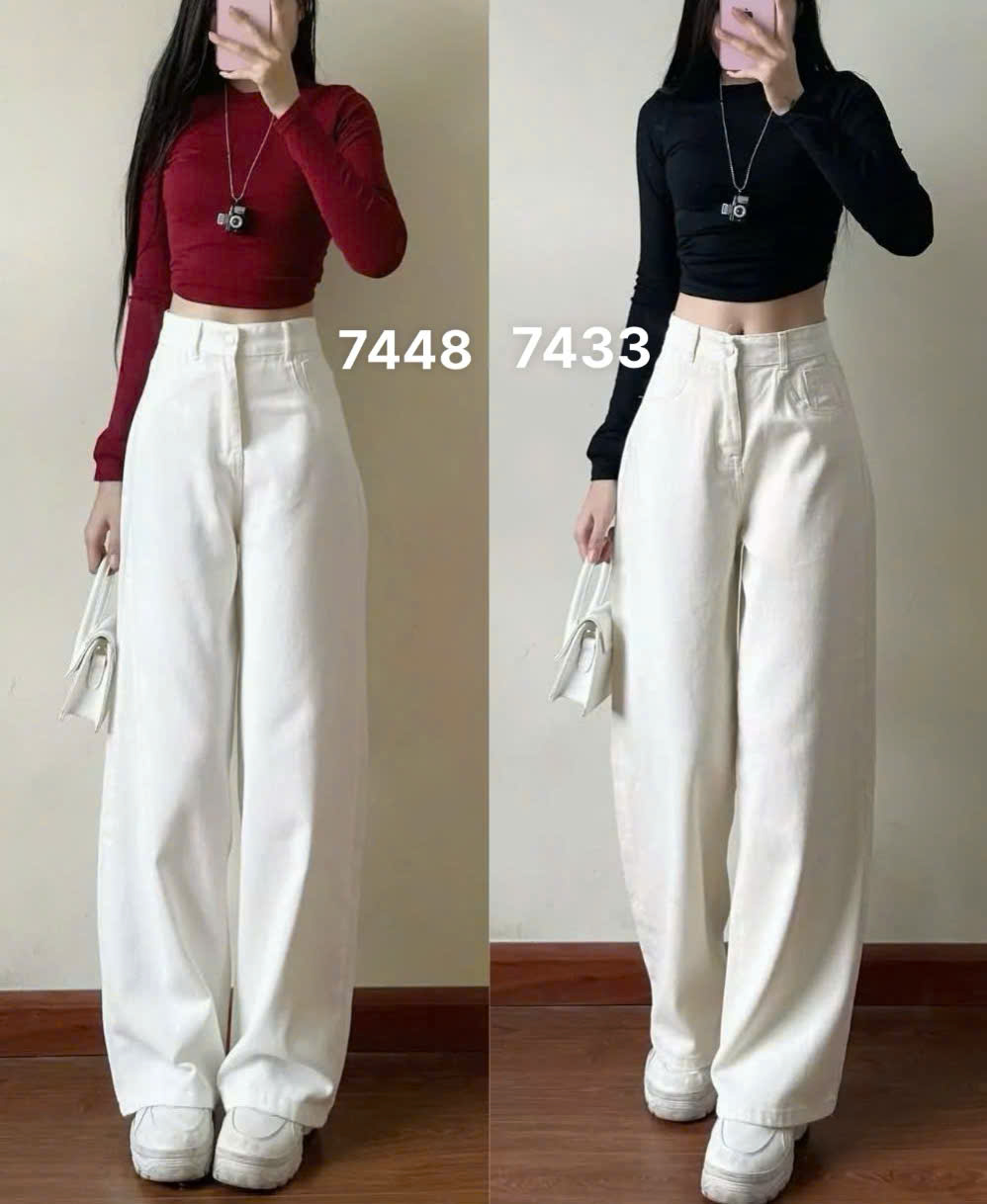 Trắng 7448 P0K12 dáng suông rộng dài 98-103 cm theo sz. Ống rộng 29-33cm theo sz. Chất jean giống nhau, dày dặn mềm mịn không lộ, Tôn dáng.
