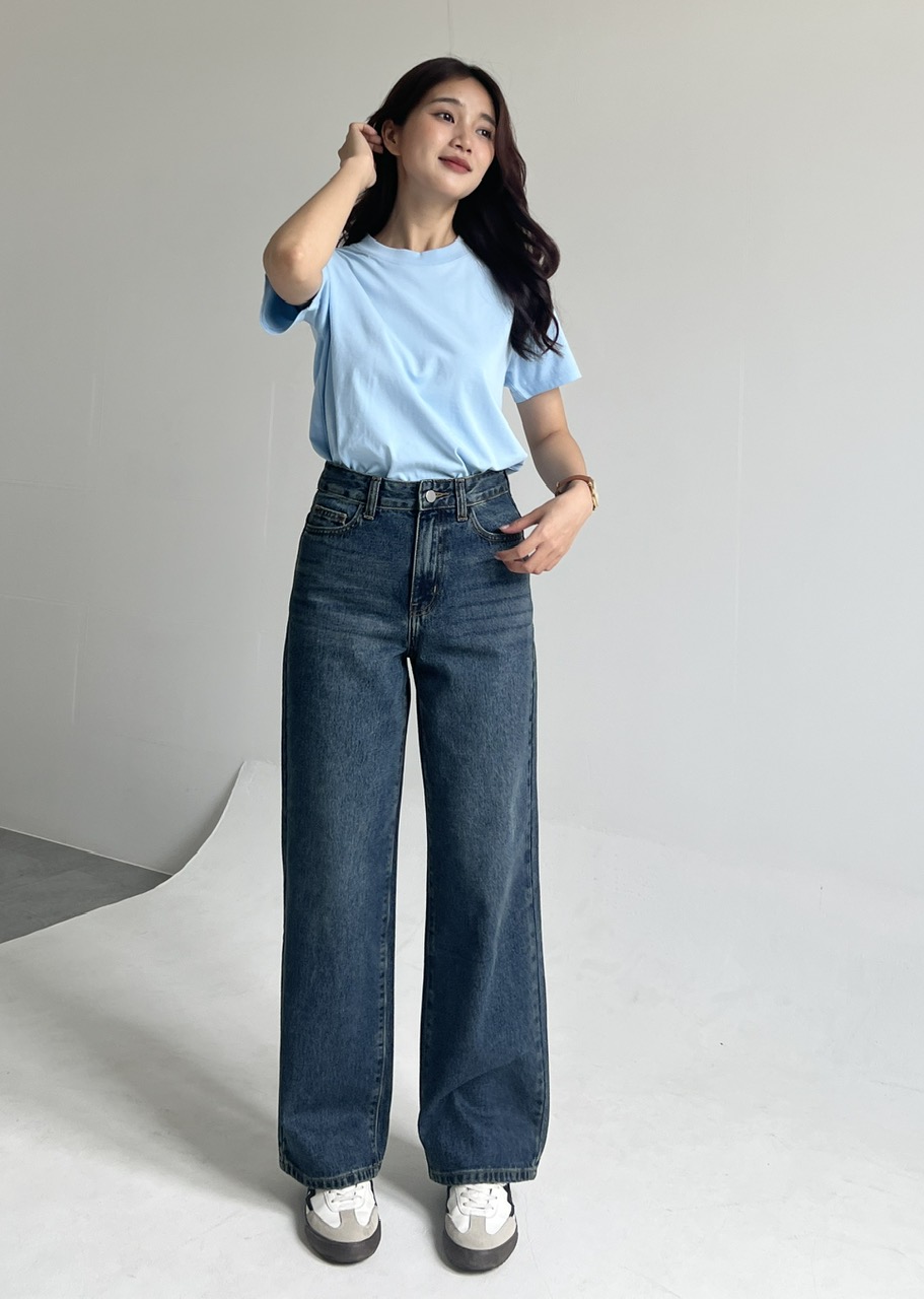 Quần Jean Suông L-03B Không Co Giãn, Lưng Cạp Cao, Màu Xanh Trầm Ánh Rêu Có Wash Hông/Đùi/Mông