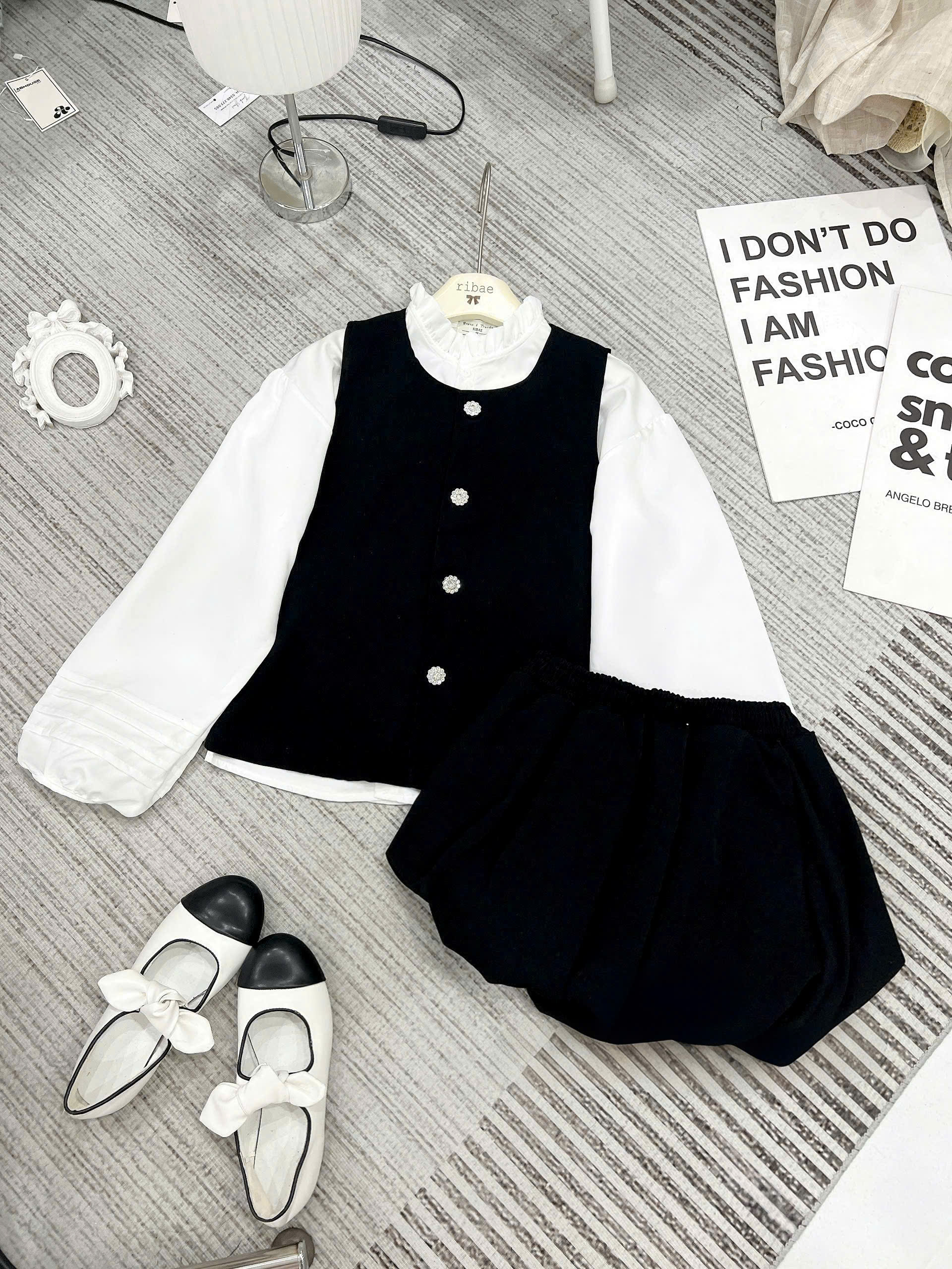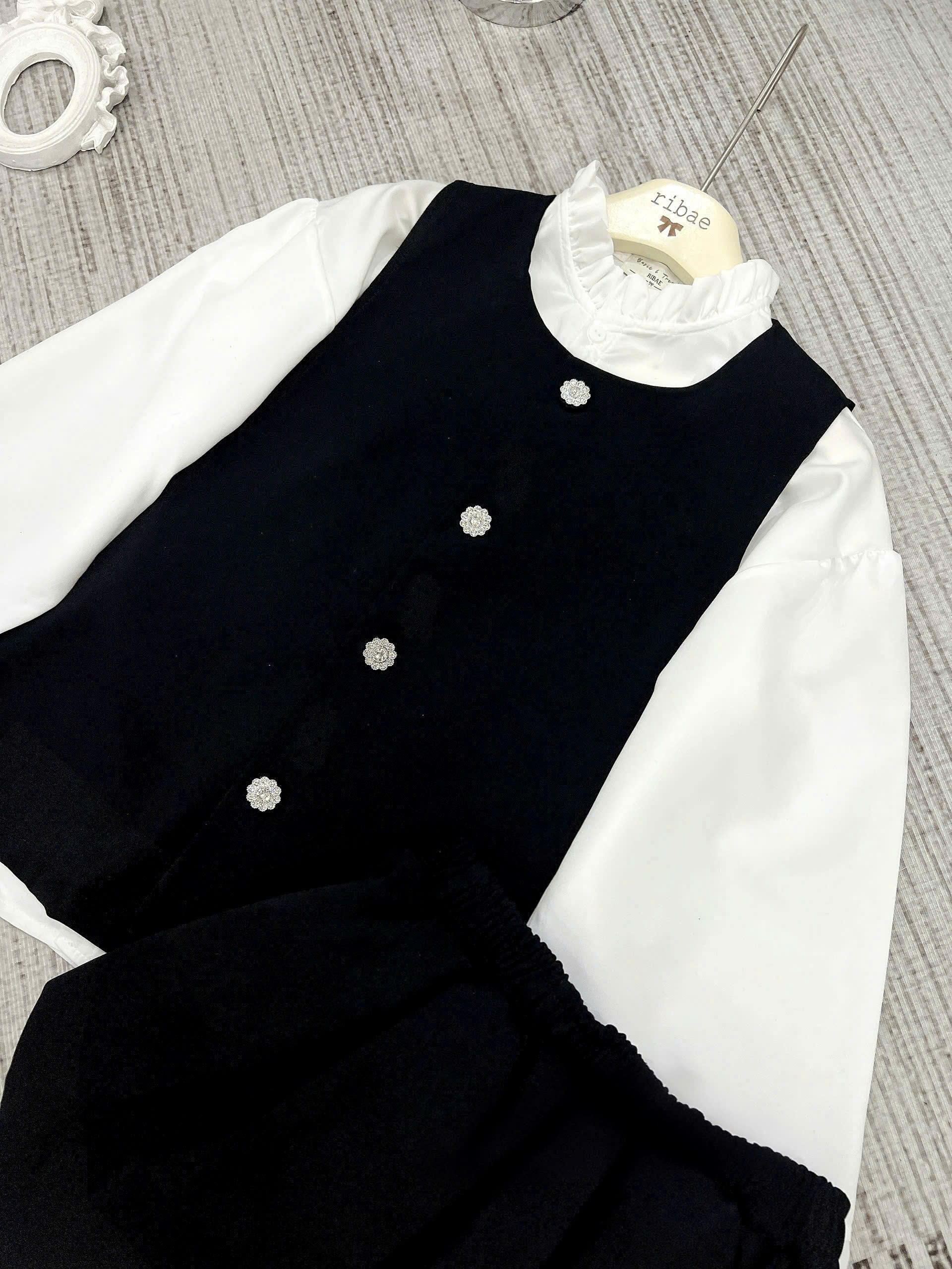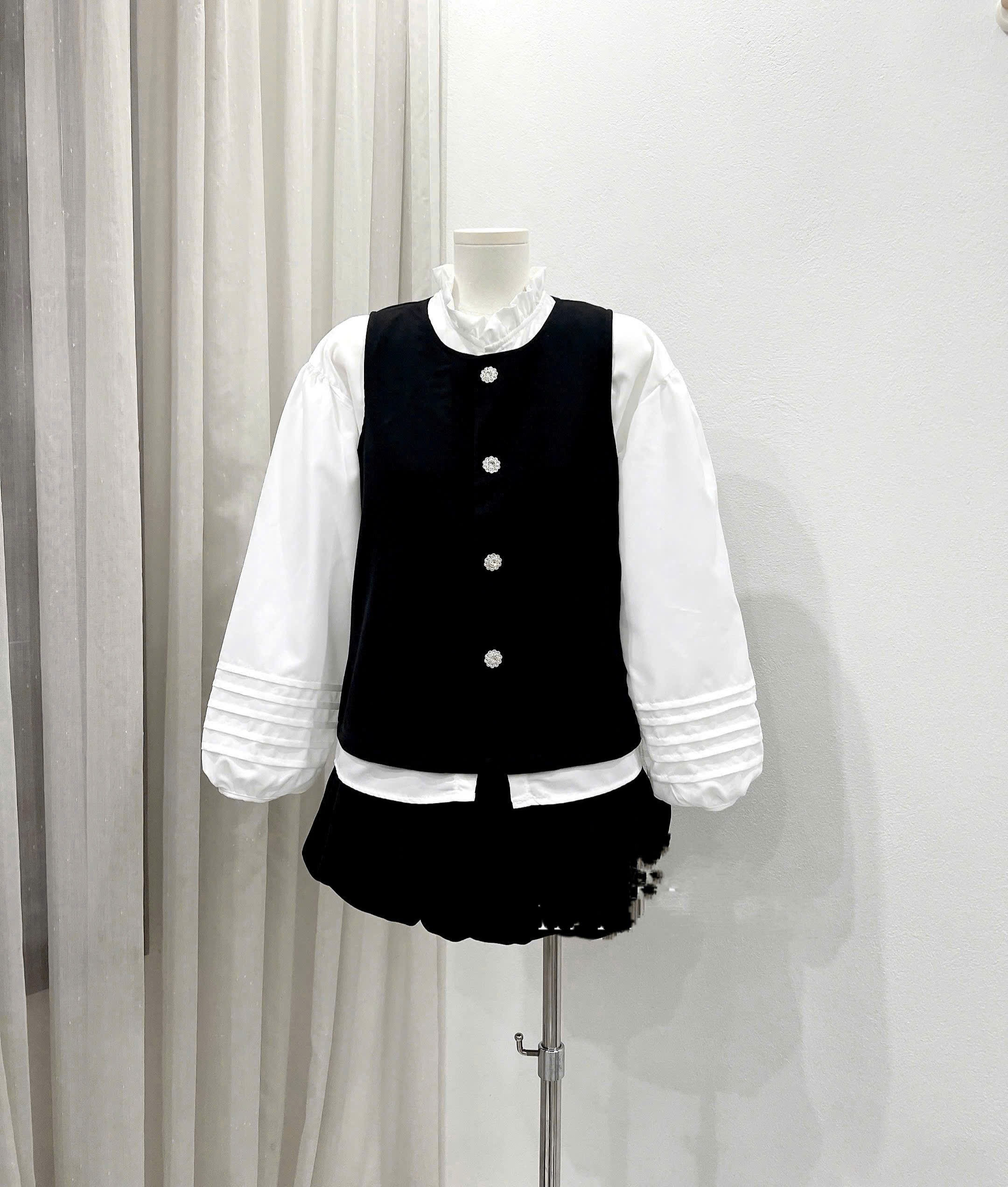 (S.2 Set 3 Món):Áo Gile Nhung Cúc Bông Tuyết +Áo Trắng Cổ Bèo Tay Bồng Thiết Kế May Gân+Chân Váy Bum-Bộ Mặc Tết