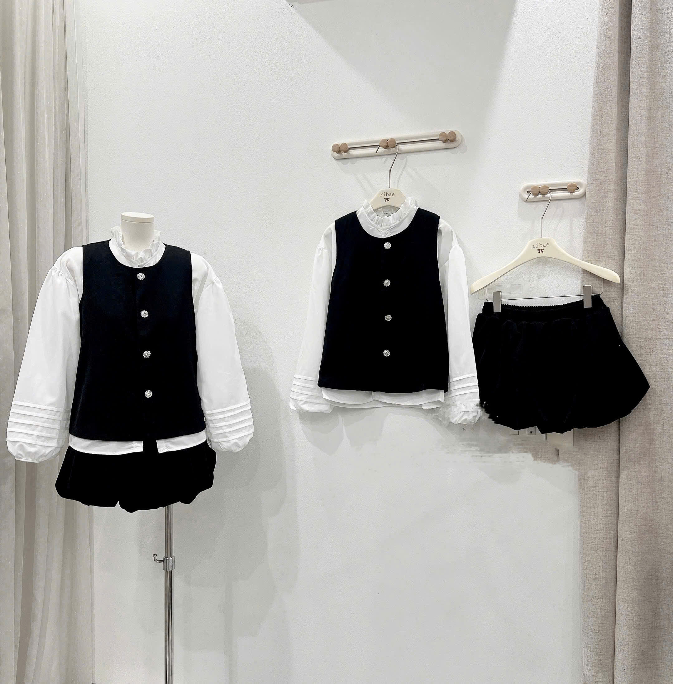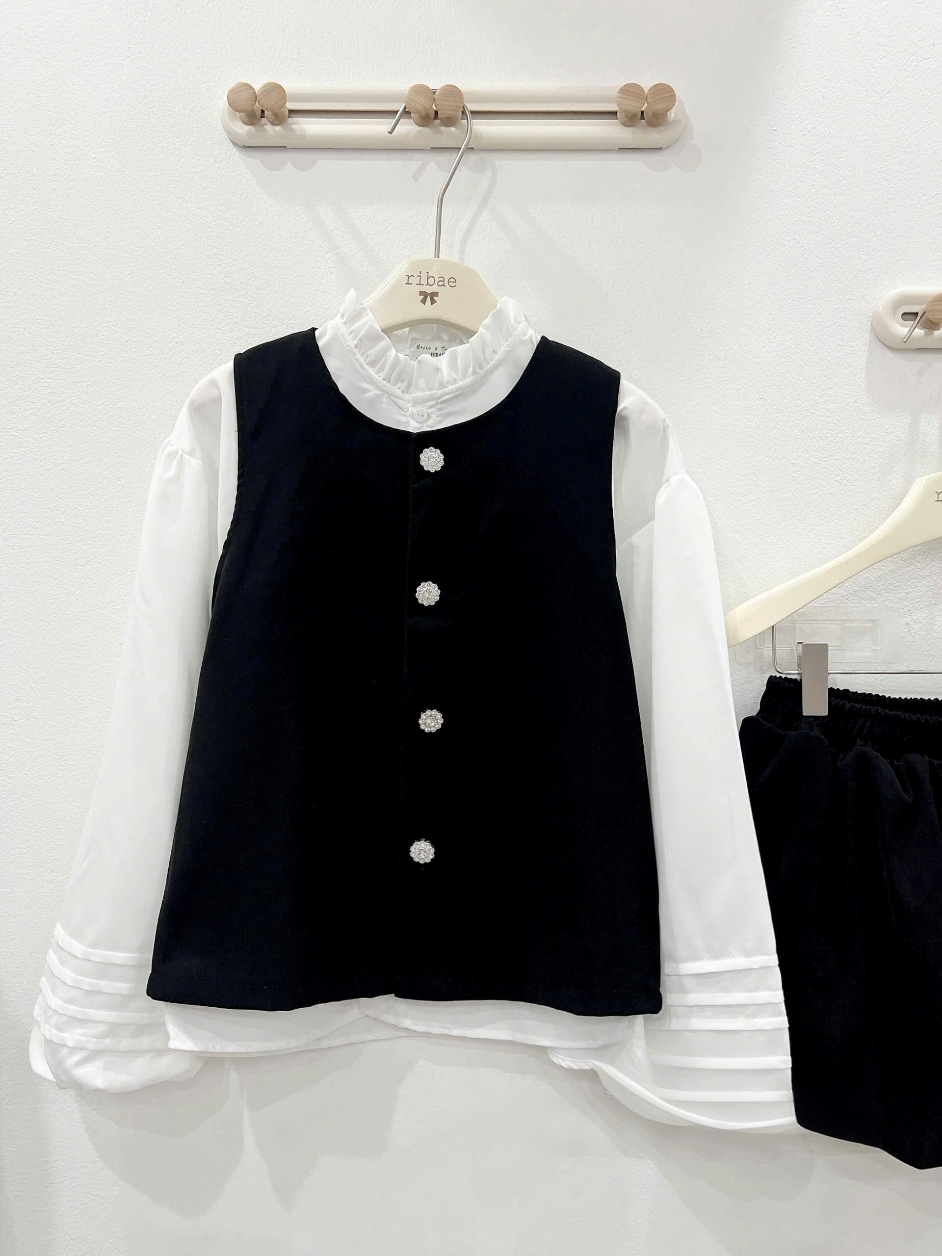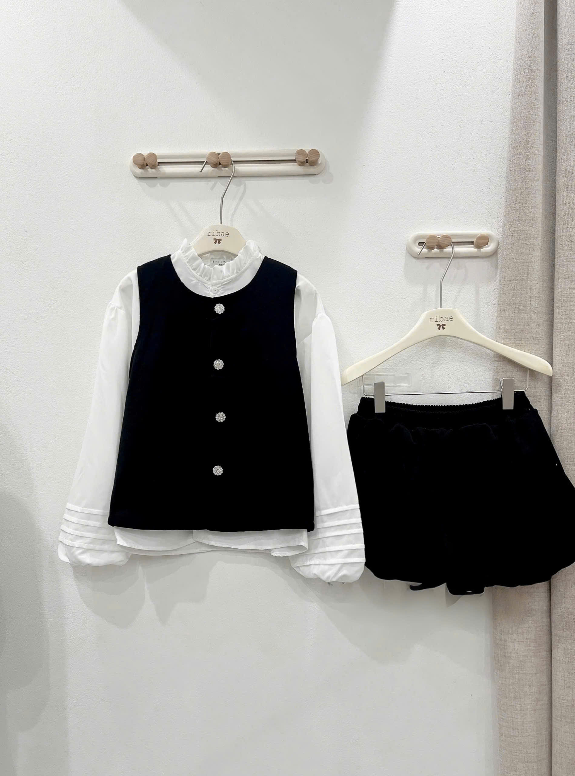 (S.2 Set 3 Món):Áo Gile Nhung Cúc Bông Tuyết +Áo Trắng Cổ Bèo Tay Bồng Thiết Kế May Gân+Chân Váy Bum-Bộ Mặc Tết