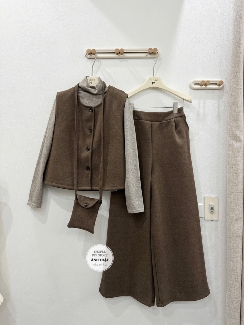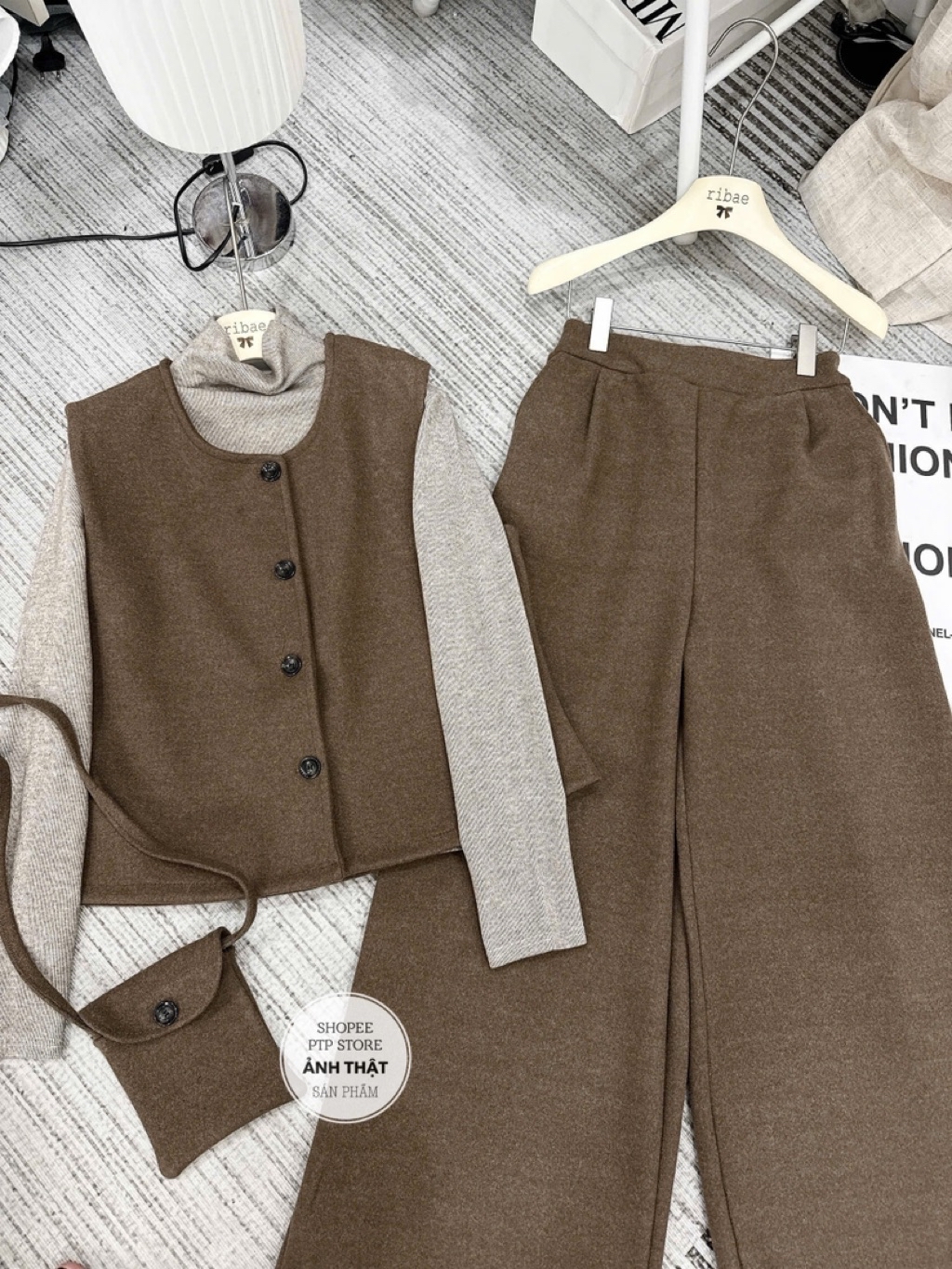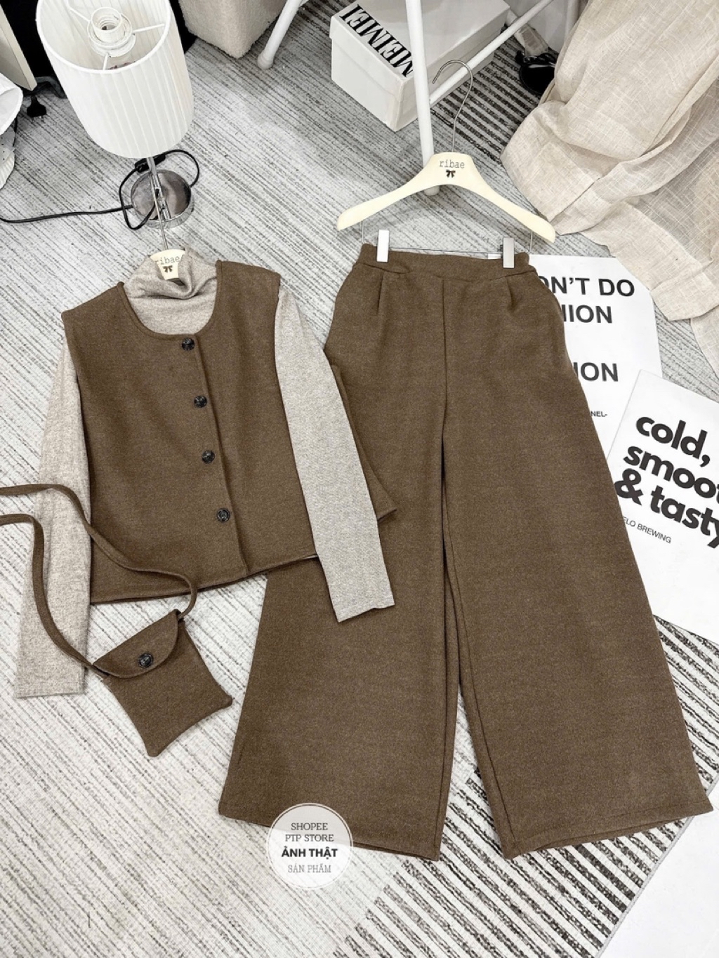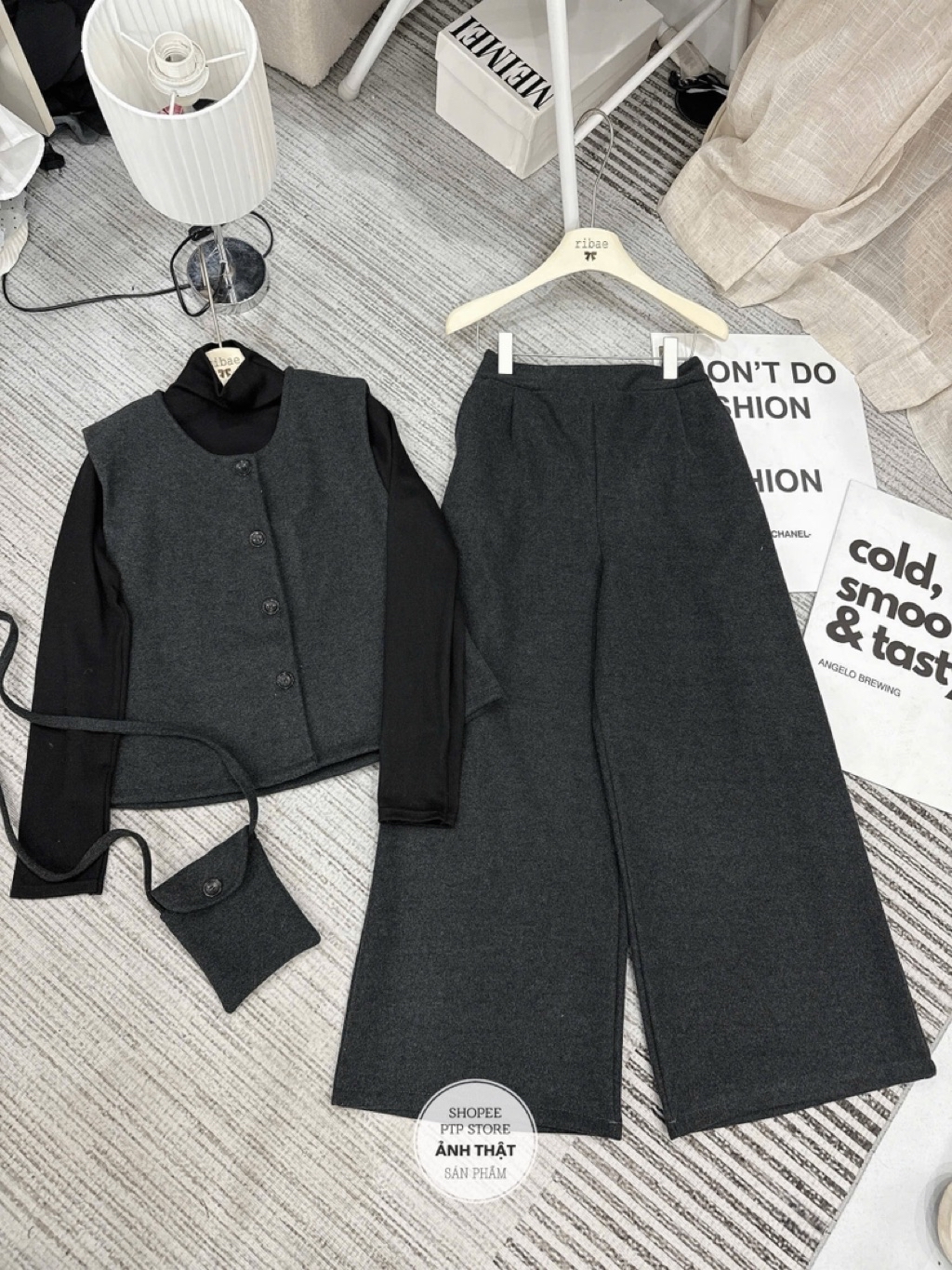 [S2.4226] Set Dạ Ép Qc 4 Món Dày Dặn Áo Len Cổ Lọ Mix Gile Dạ +Quần Suông Ống Rộng + Túi Đeo Chéo 3 Màu(cạp chun)