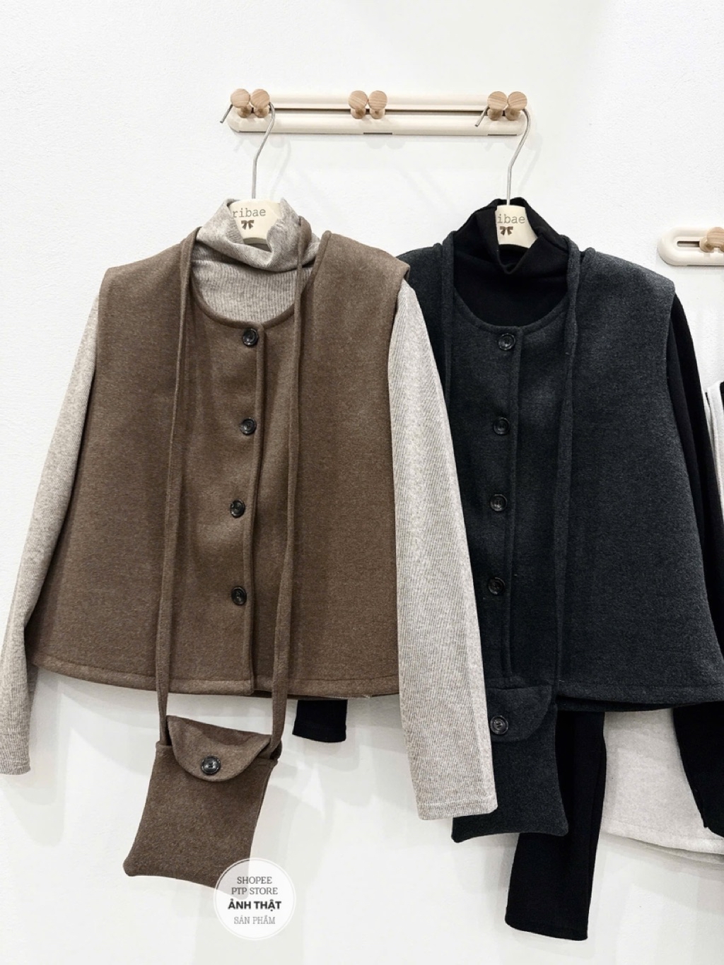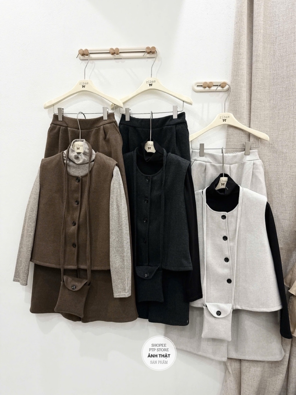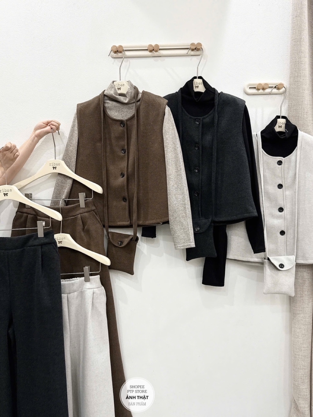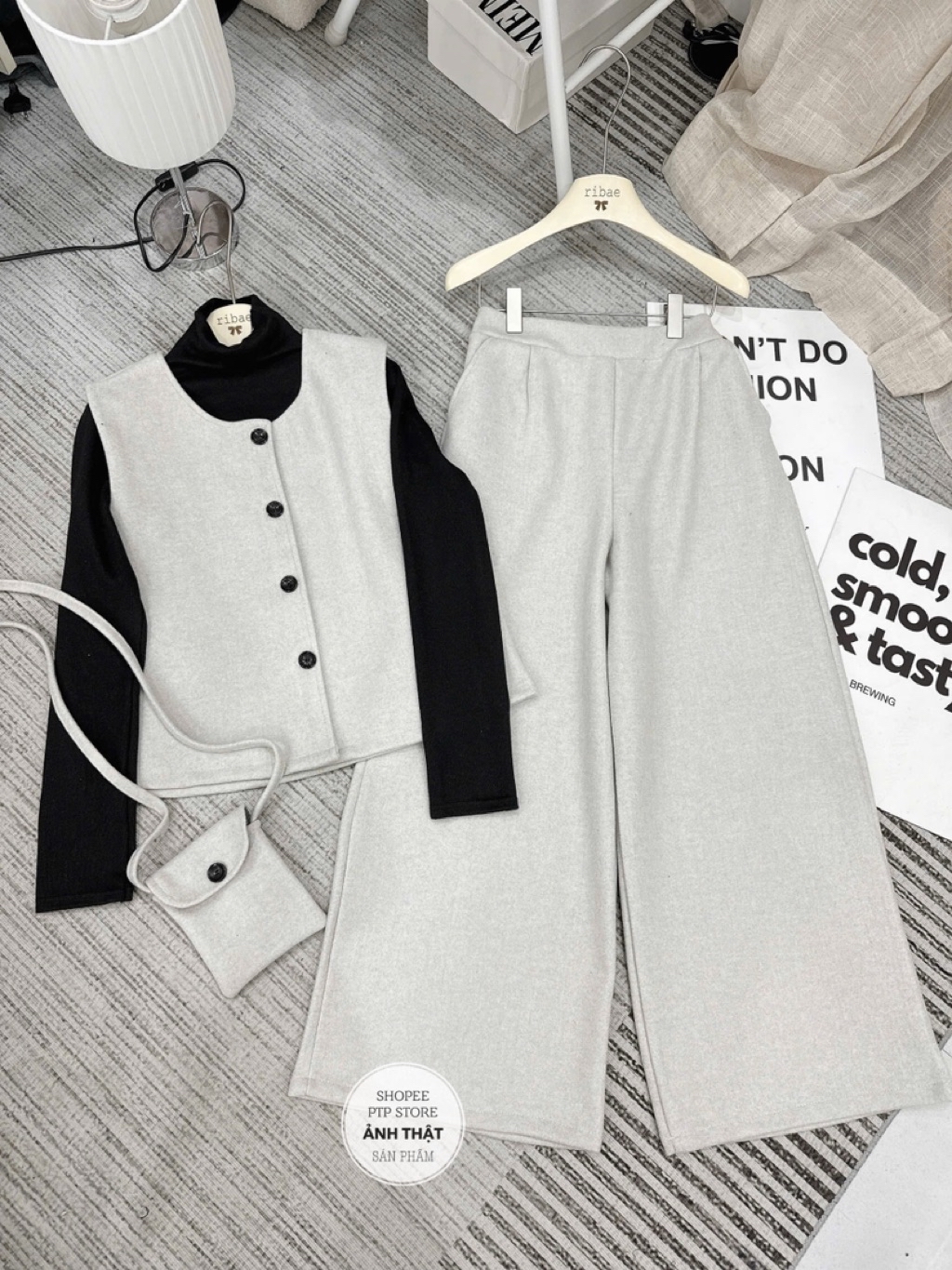 [S2.4226] Set Dạ Ép Qc 4 Món Dày Dặn Áo Len Cổ Lọ Mix Gile Dạ +Quần Suông Ống Rộng + Túi Đeo Chéo 3 Màu(cạp chun)