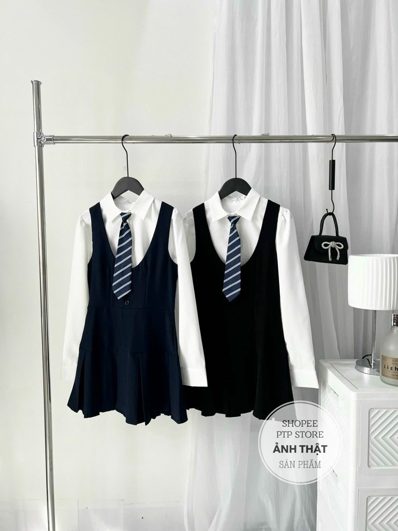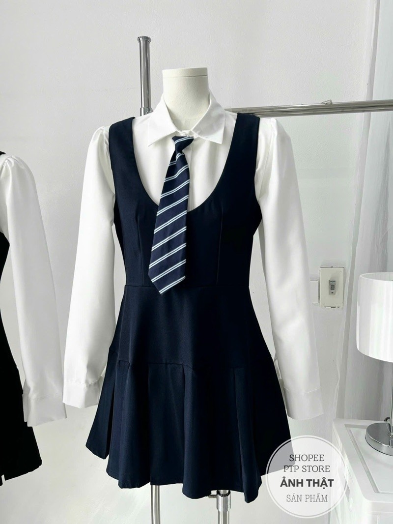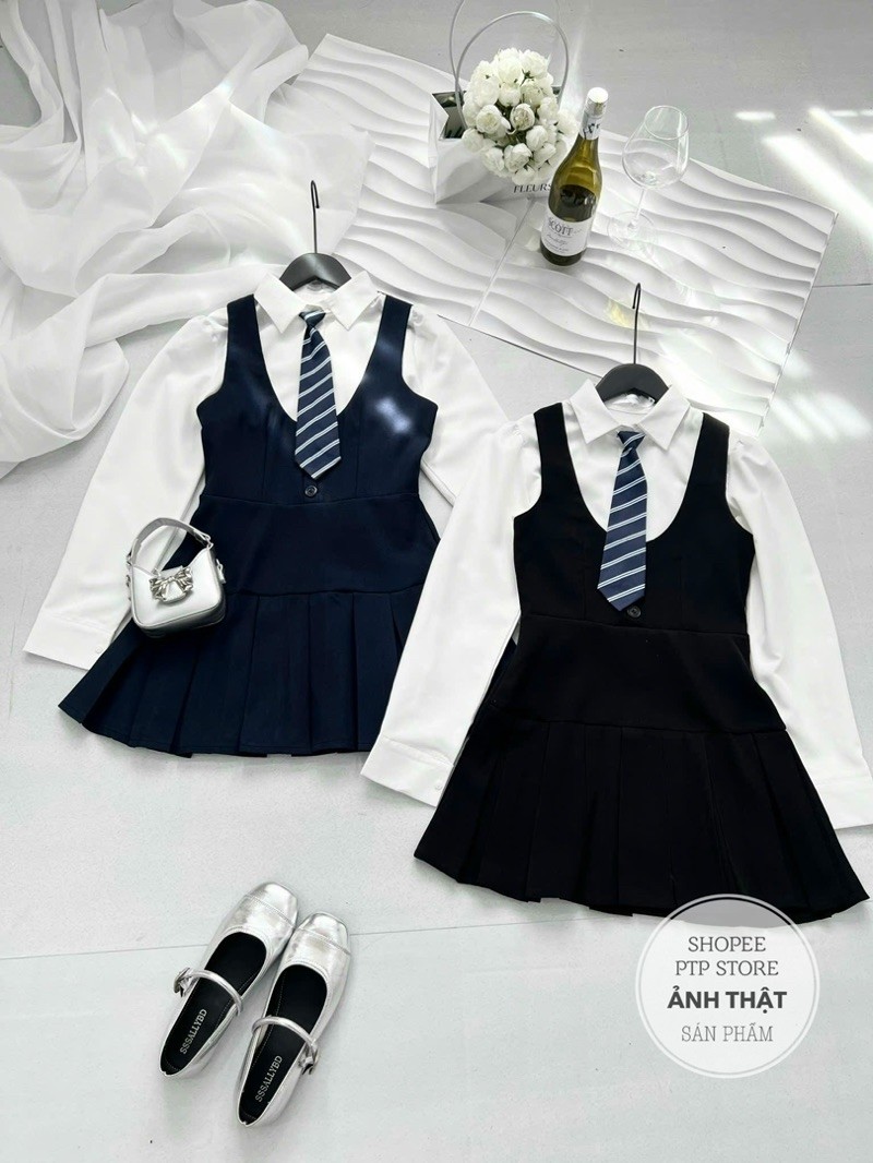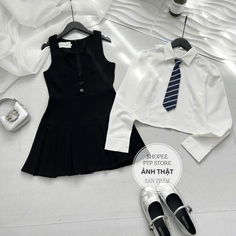 [S2.935] Set Áo Sơmi Trắng Kèm Cavat Rời Mix Yếm Tuyết Mưa Xếp Ly Dày Dặn 2 Màu