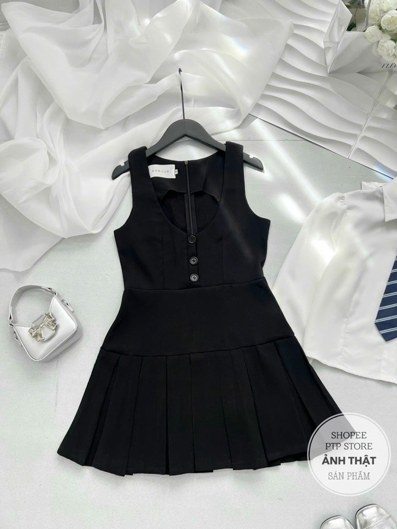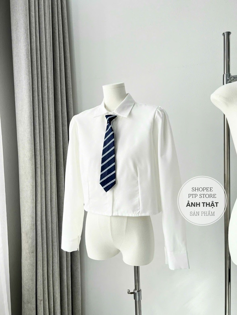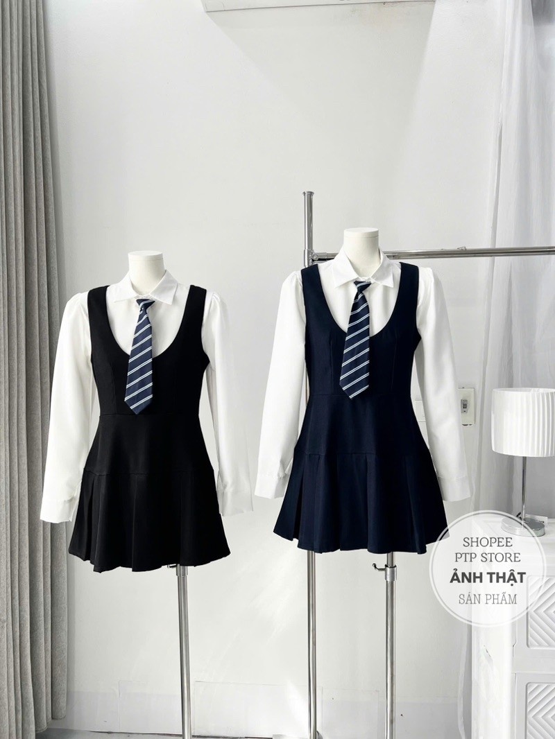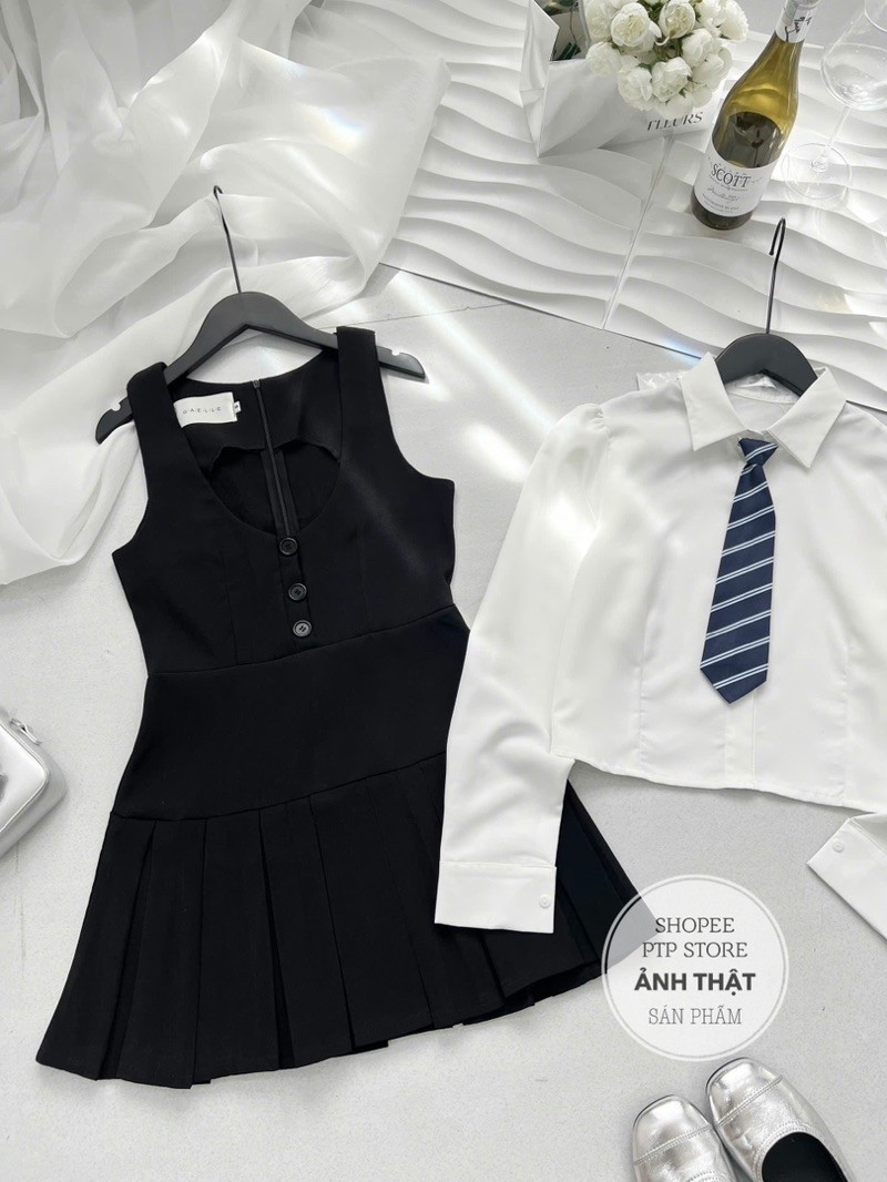 [S2.935] Set Áo Sơmi Trắng Kèm Cavat Rời Mix Yếm Tuyết Mưa Xếp Ly Dày Dặn 2 Màu