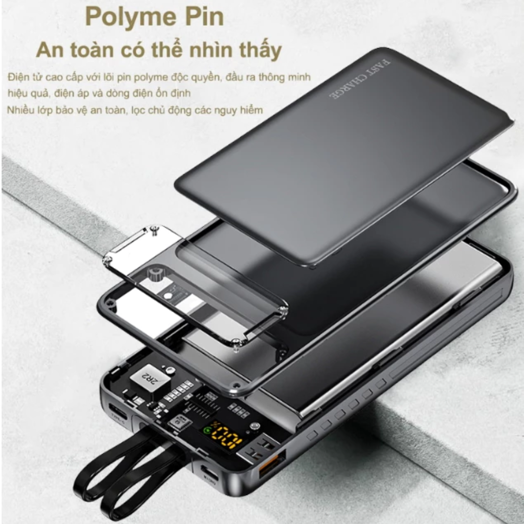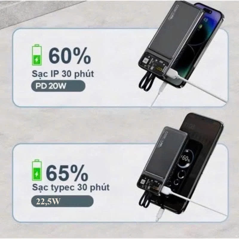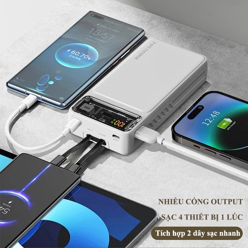 Sạc dự Phòng Led 30000mah - Sạc nhanh 120W - Tích Hợp 2 dây sạc LN và Type C Màn hình hiển thị % Pn