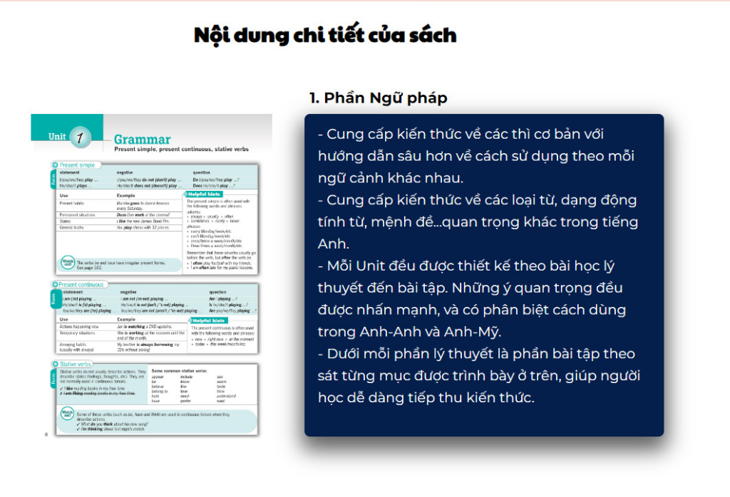 Toàn bộ 28 units của sách chia ra lần lượt phần Ngữ pháp và từ vựng đan xen nhau. Sau mỗi 2 units Destination B1: Grammar & Vocabulary sẽ cung cấp phần Preview 1 unit vừa học để các bạn ôn tập lại kiến thức vừa học. Điều này giúp các bạn nắm vững và nhớ lâu kiến thức.