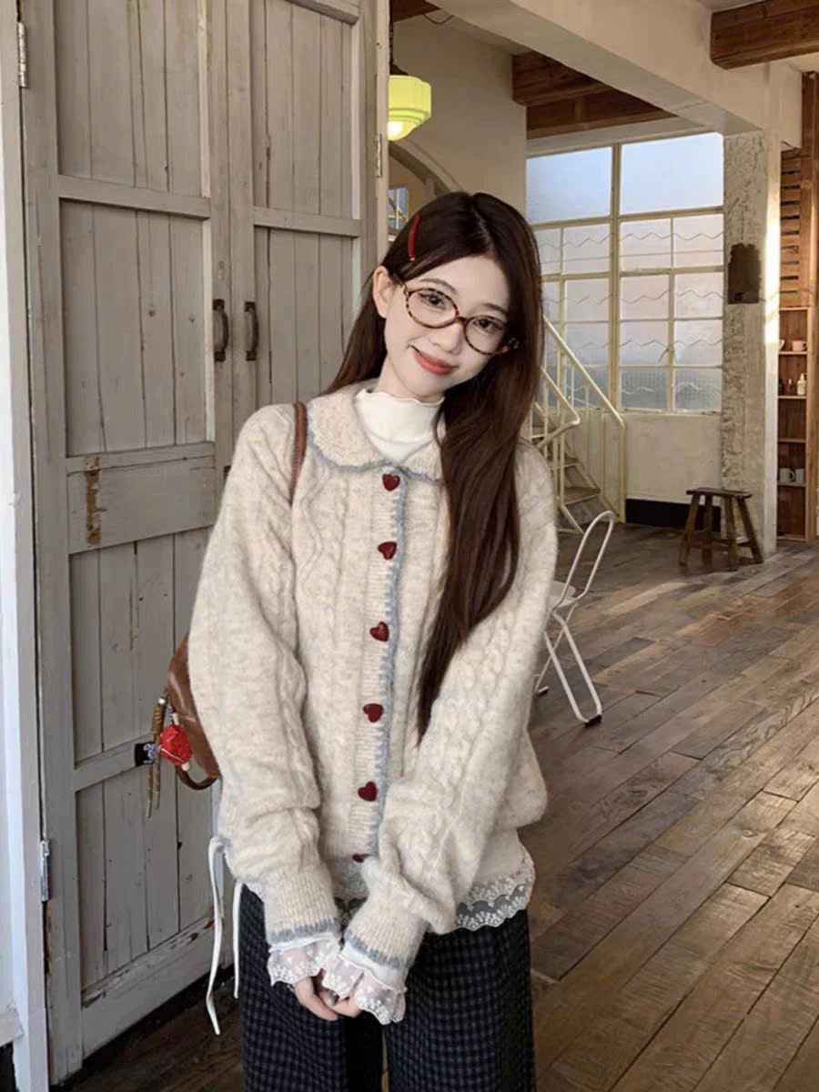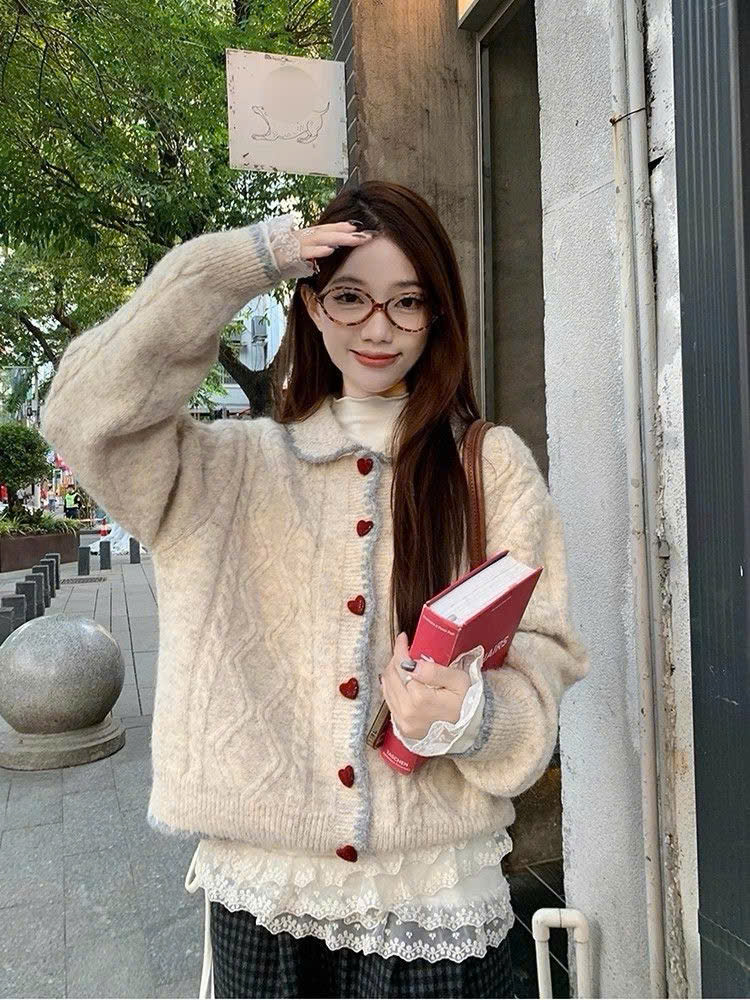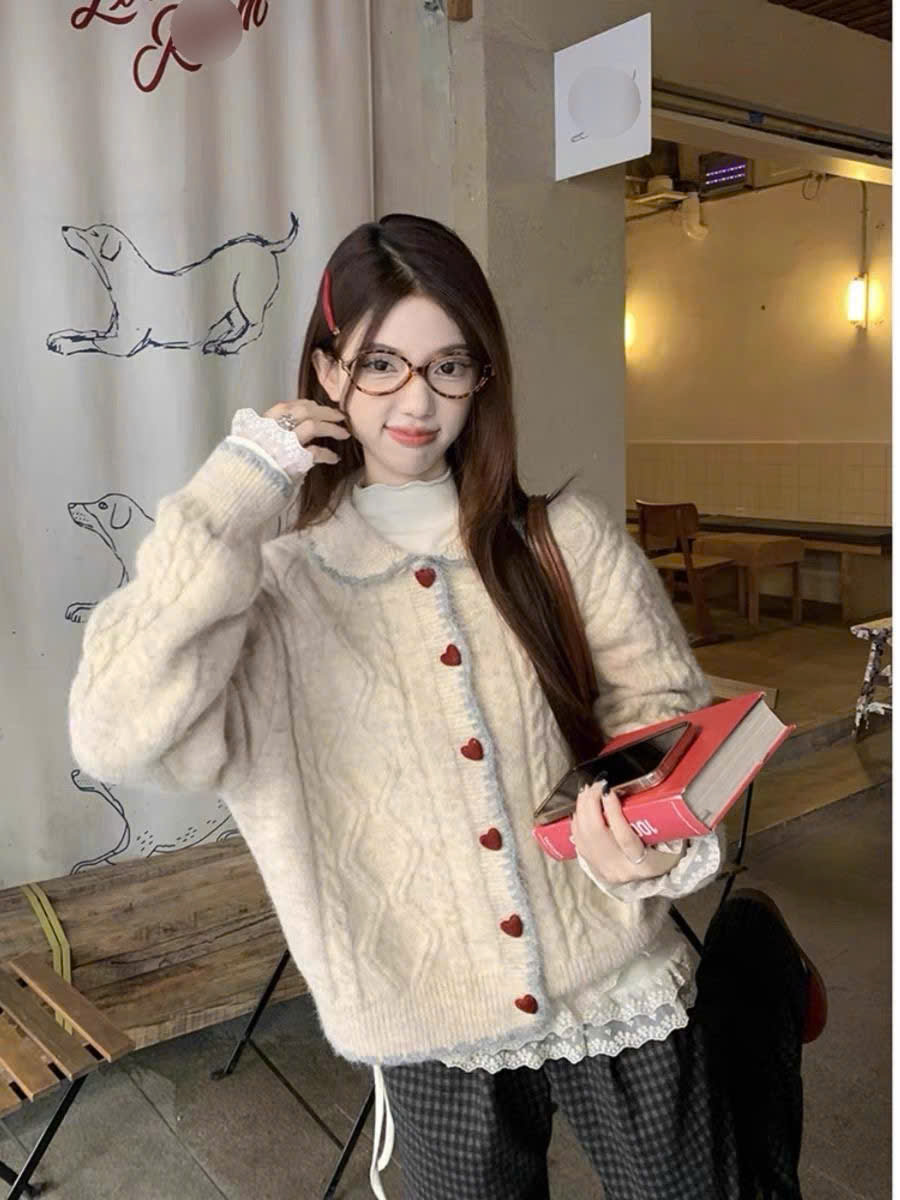 Áo Khoác Cardigan Nữ Dày Dặn Cúc Tim, Áo Khoác Len Cổ Bẻ Điệu Đà Dễ Phối Đồ
