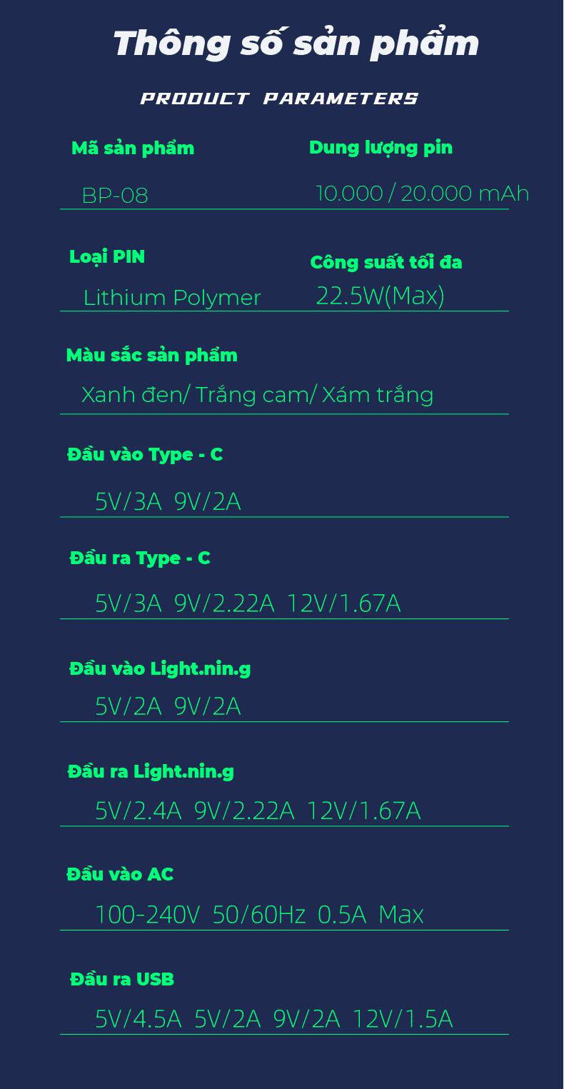 ✔️THÔNG SỐ KỸ THUẬT SẠC DỰ PHÒNG BP08